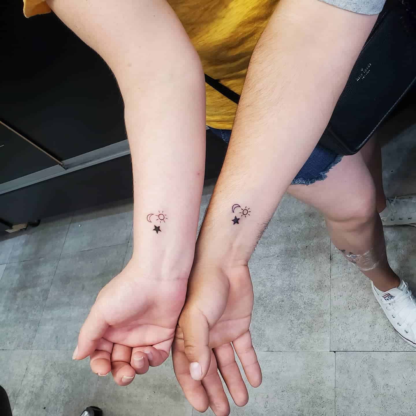This image showcases a really beautiful bond between siblings, highlighted by their matching sun and moon tattoos on their wrists.