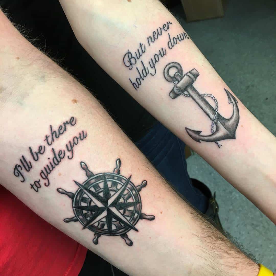 This image showcases such beautiful tattoos that symbolize a deep bond between siblings. The compass and anchor designs are perfect for representing guidance and support.