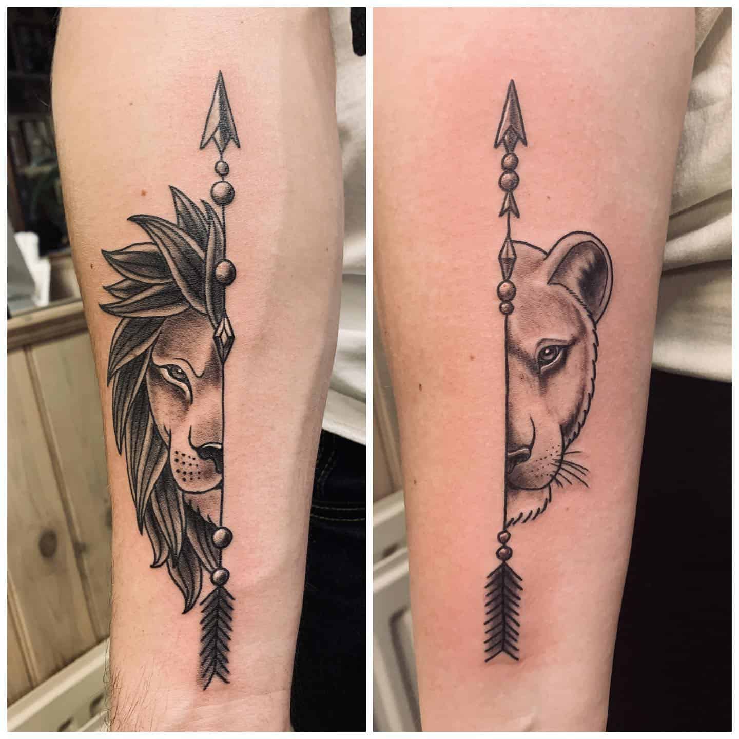 I am obsessed with this striking tattoo design. It features a fierce lion and a graceful lioness, which is a perfect symbol of a strong bond between siblings.