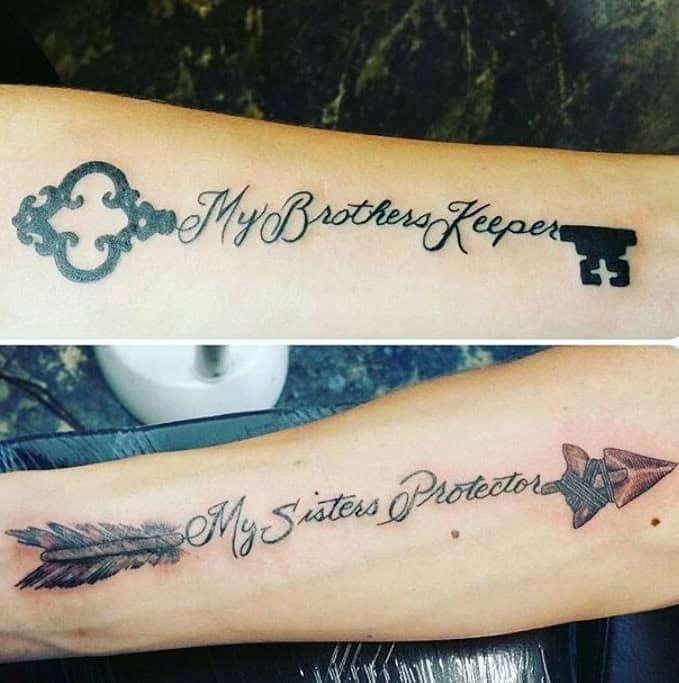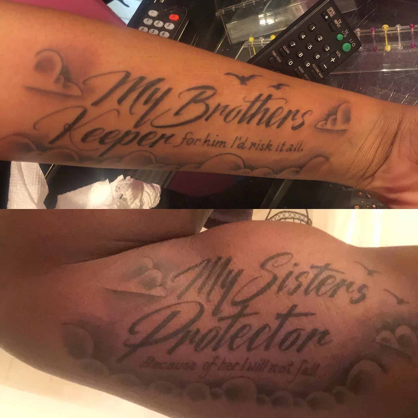 The heartfelt phrases, “My Brother’s Keeper” and “My Sister’s Protector,” really highlight their commitment to each other, which makes these tattoos feel truly special.