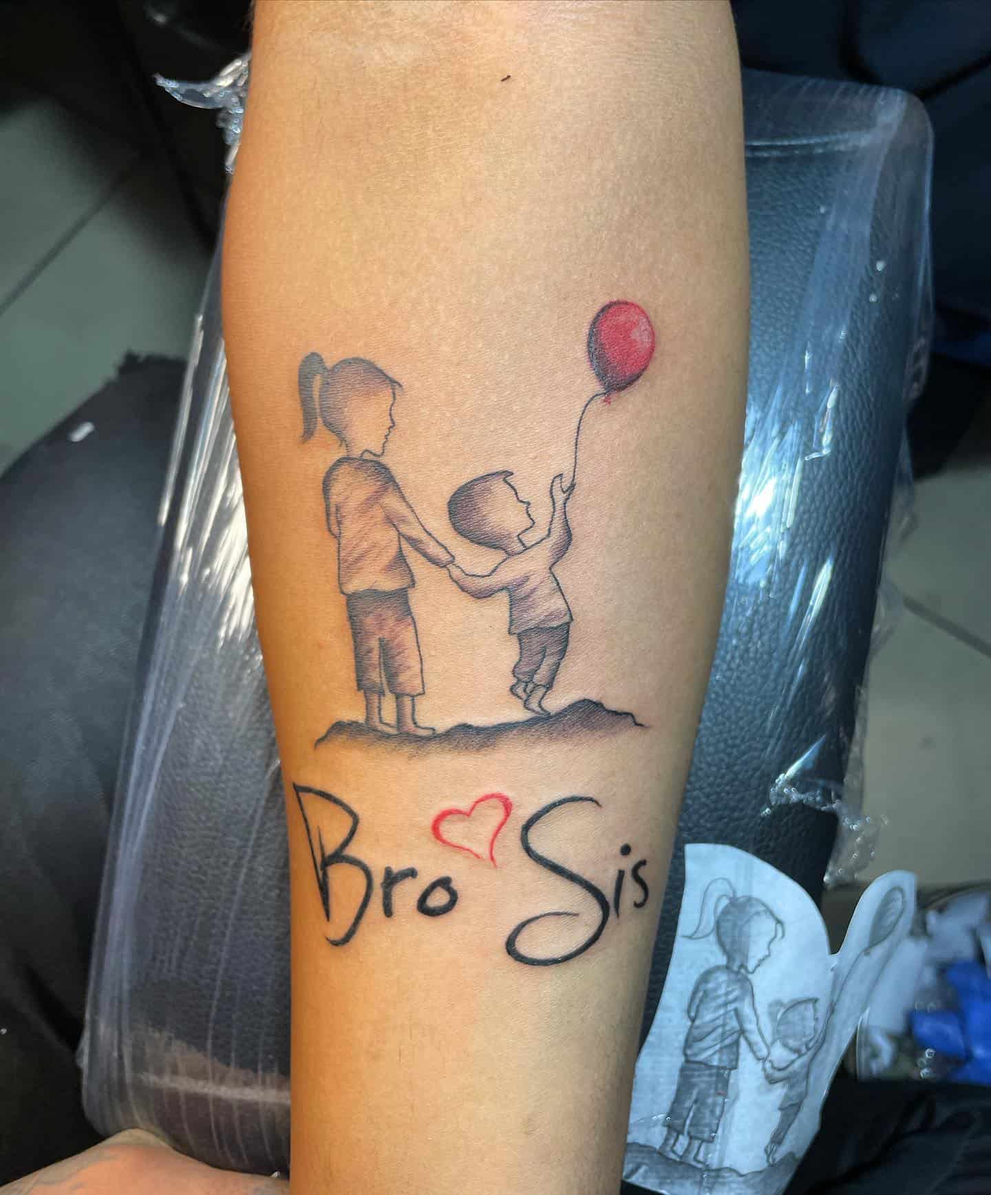 This tattoo beautifully captures that joyful connection between a brother and sister. It shows a really tender moment of them sharing a balloon.