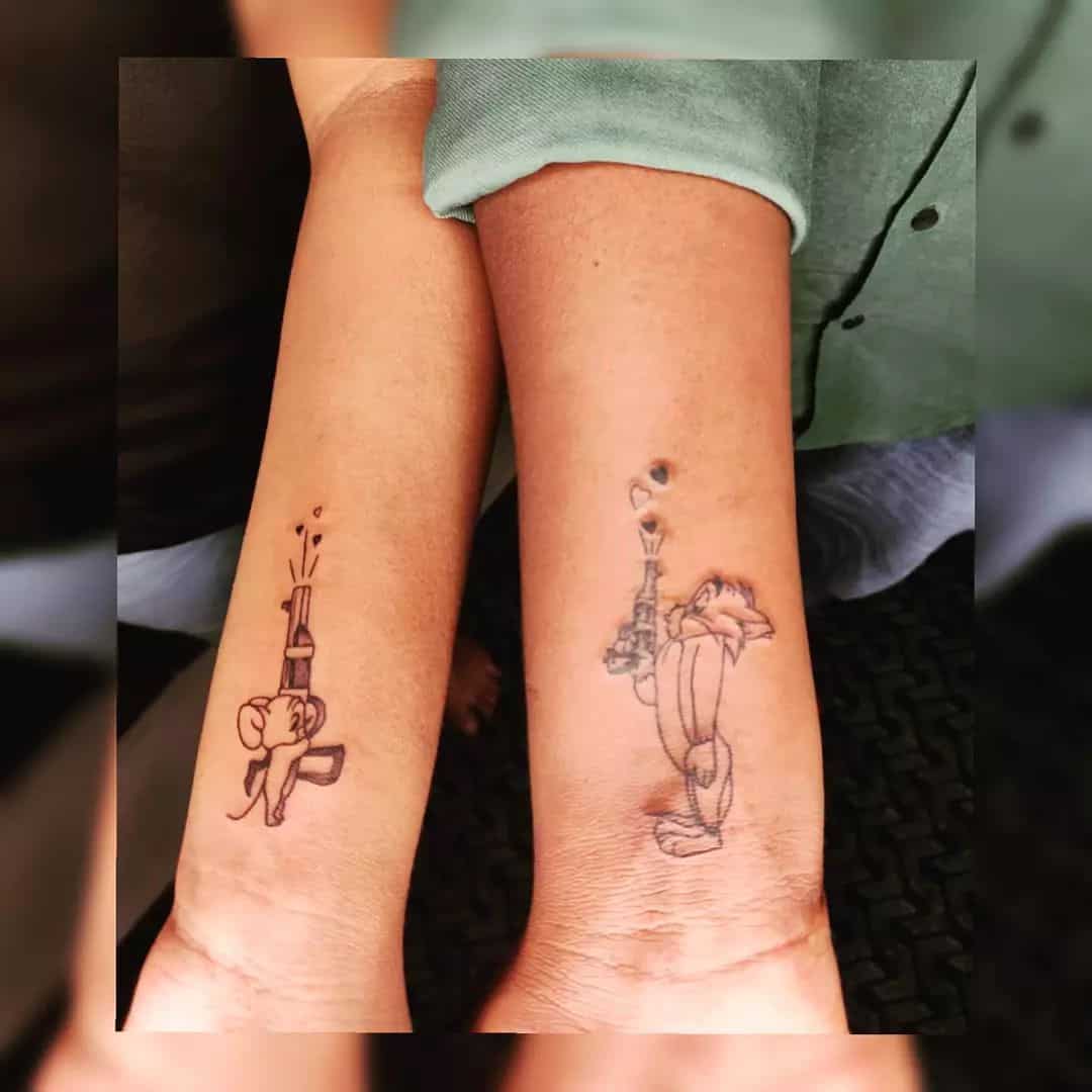 One tattoo has a cute elephant with a colorful gun, and the other shows a stylish character holding a heart-shaped weapon, which really symbolizes their unique bond.