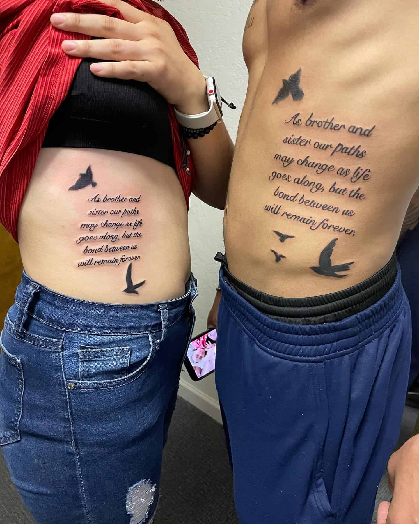 This image captures the heartfelt connection between a brother and sister through their matching tattoos.