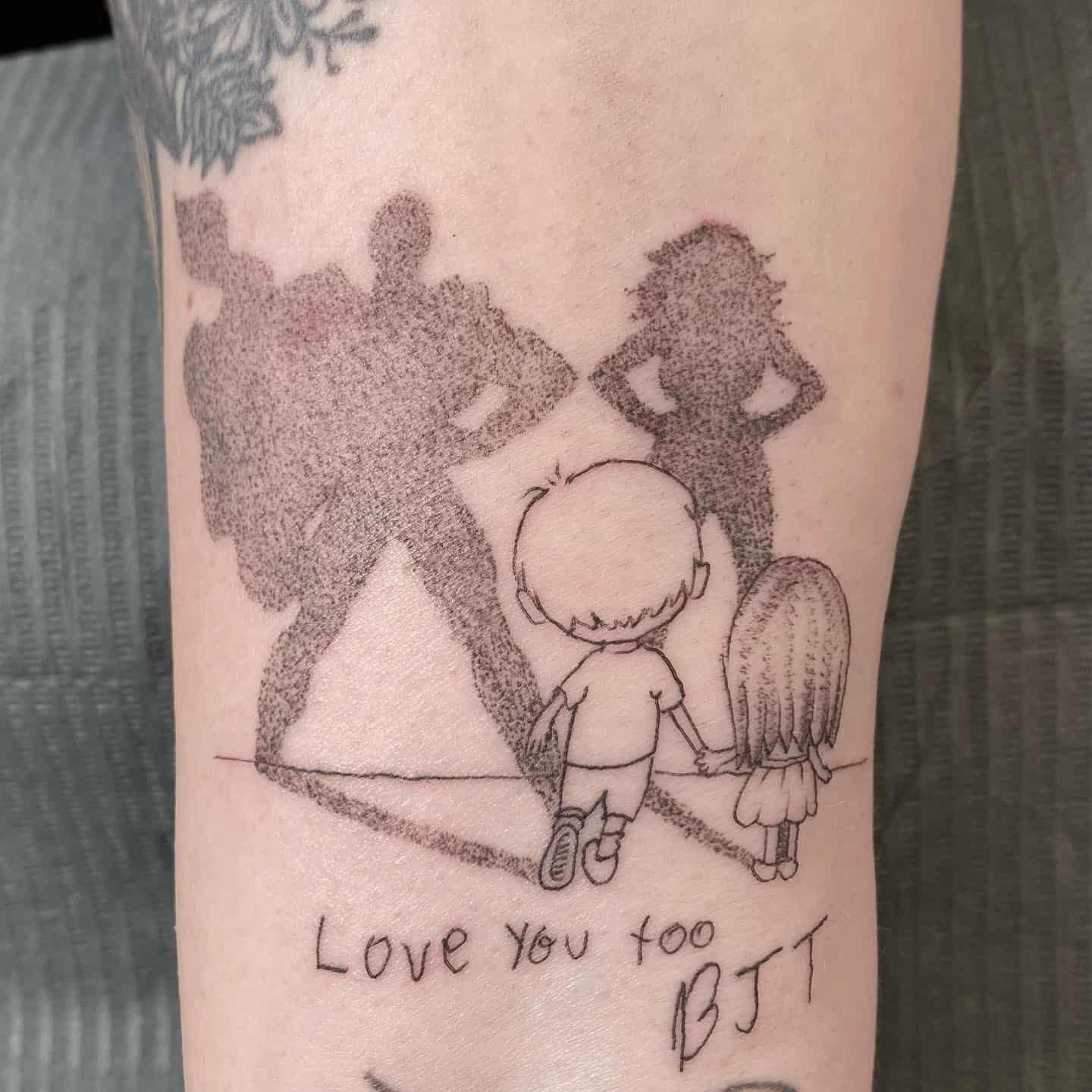 This tattoo is such a sweet capture of a moment between a brother and sister, walking hand-in-hand toward what looks like their parents.
