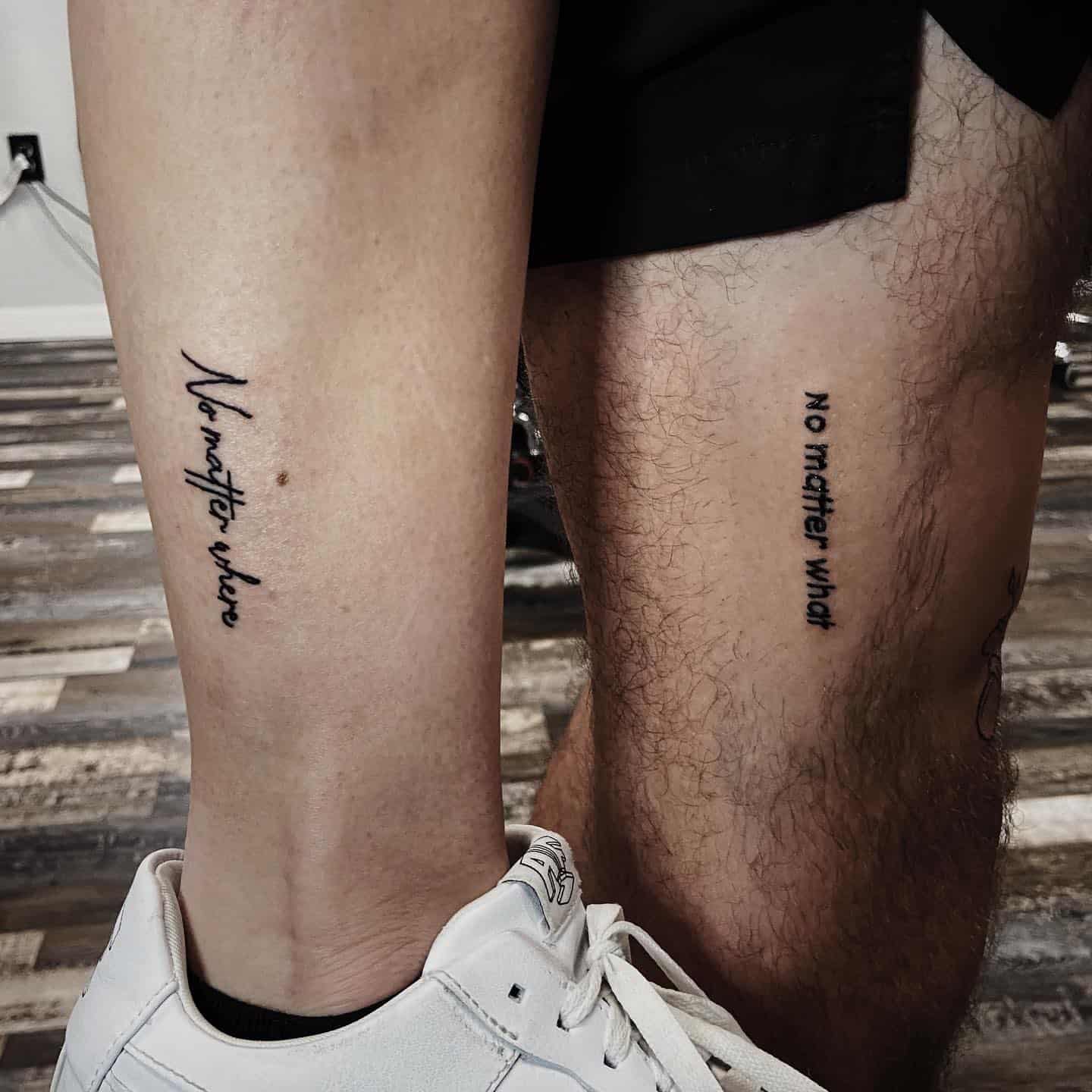 This image showcases two tattoos that beautifully express an unbreakable sibling connection. The phrases “No matter where” and “No matter what” are powerful reminders of loyalty and support.