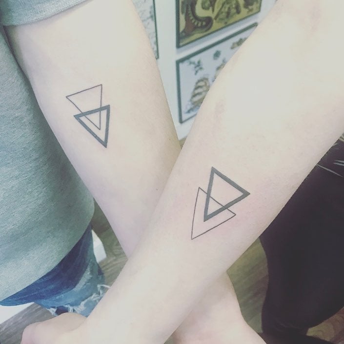 This image showcases a pair of simple yet striking triangle tattoos on the forearms of a brother and sister.