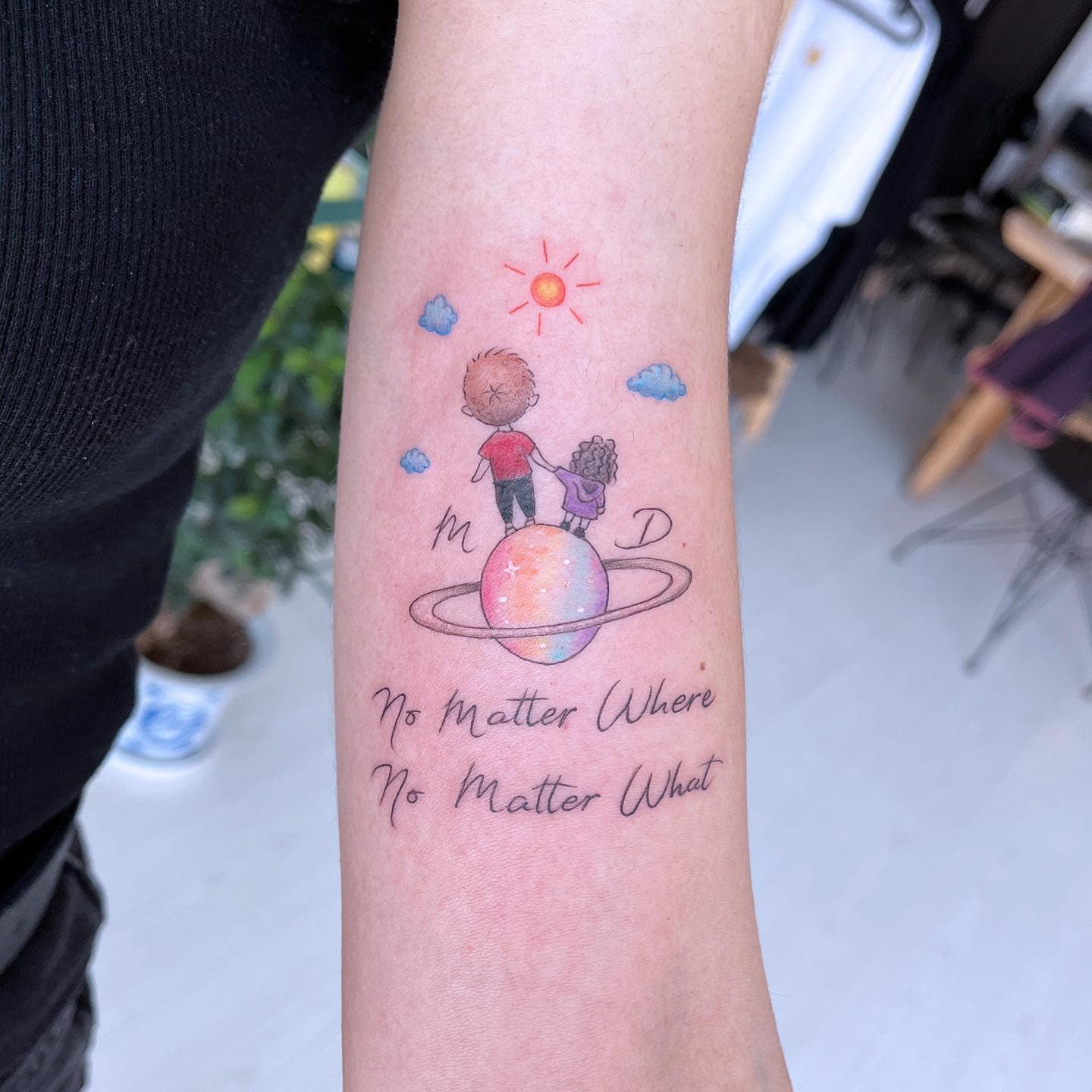 This tattoo captures a whimsical scene of a brother and sister standing together on a colorful planet, looking up at the sun.