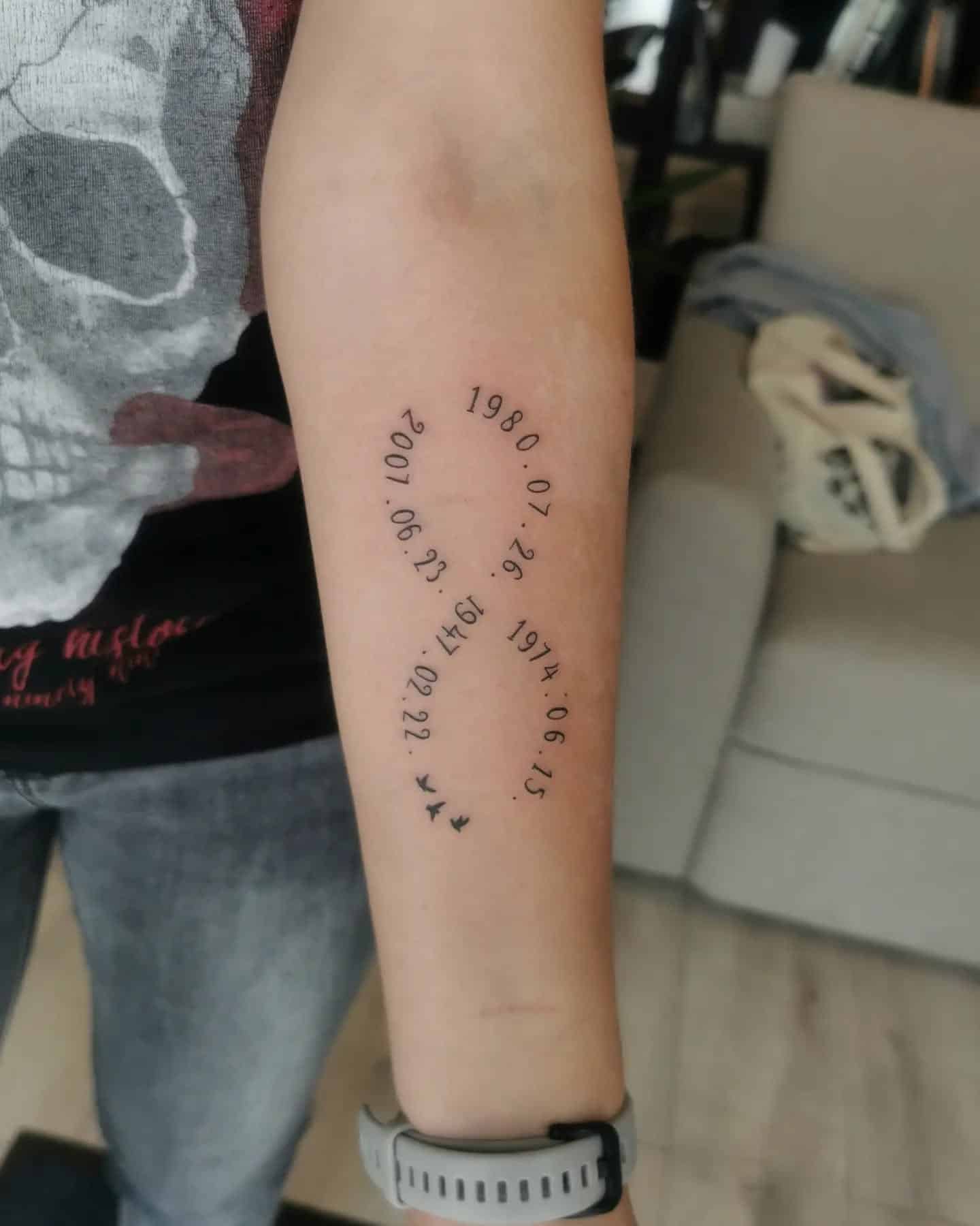 This tattoo is so beautiful. It showcases a series of important dates that form a unique circle, symbolizing the journey of life.