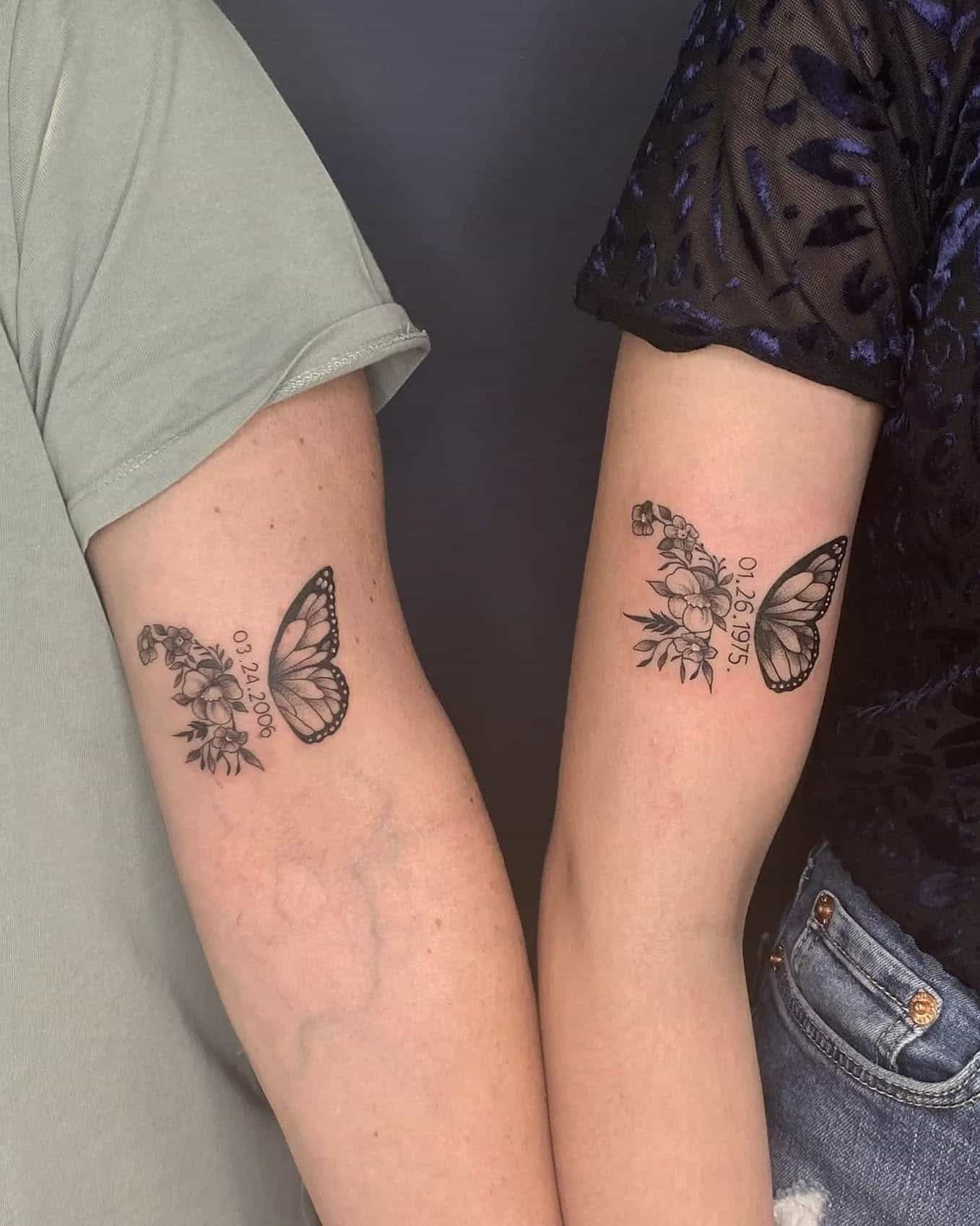 This image showcases a beautiful pair of tattoos featuring delicate butterflies and flowers, which is such a lovely symbol of a close sibling connection.