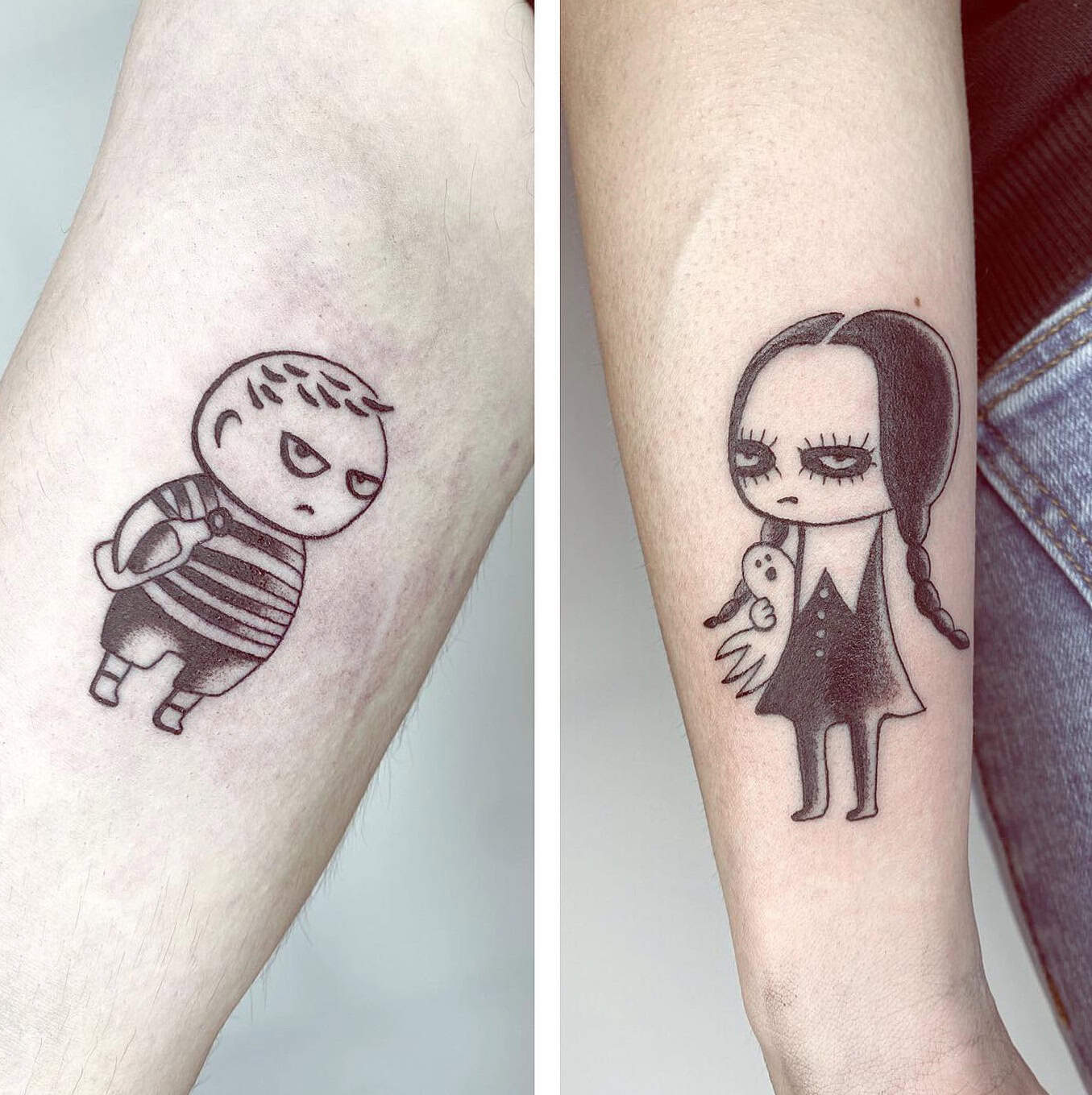 I love these two playful tattoos that perfectly capture the bond between siblings. One features a mischievous boy with a playful expression, while the other shows a girl with a ghost doll.