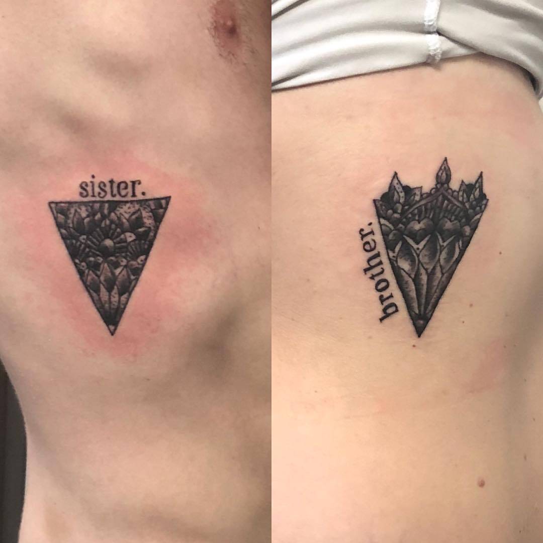 This image showcases two arms with matching triangular tattoos, and it creates such a striking visual bond between the siblings.
