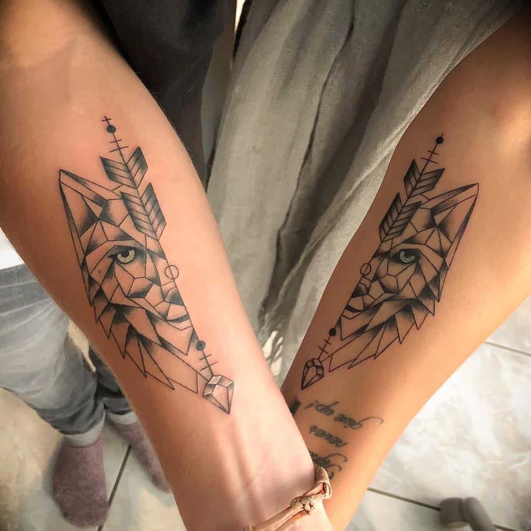 This is such a striking image. It features two beautifully designed wolf tattoos, which really showcase a strong bond between siblings.