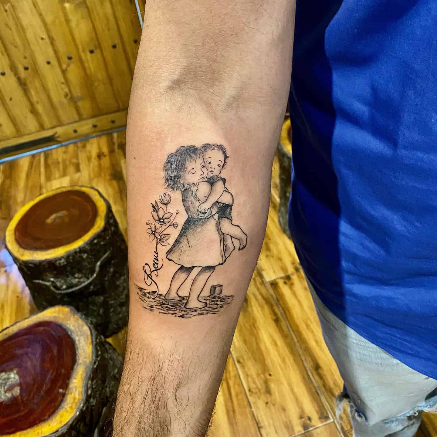 I’m seriously crushing on this delightful tattoo. It captures the heartwarming bond between a brother and sister with its playful illustration of two kids in a sweet embrace.