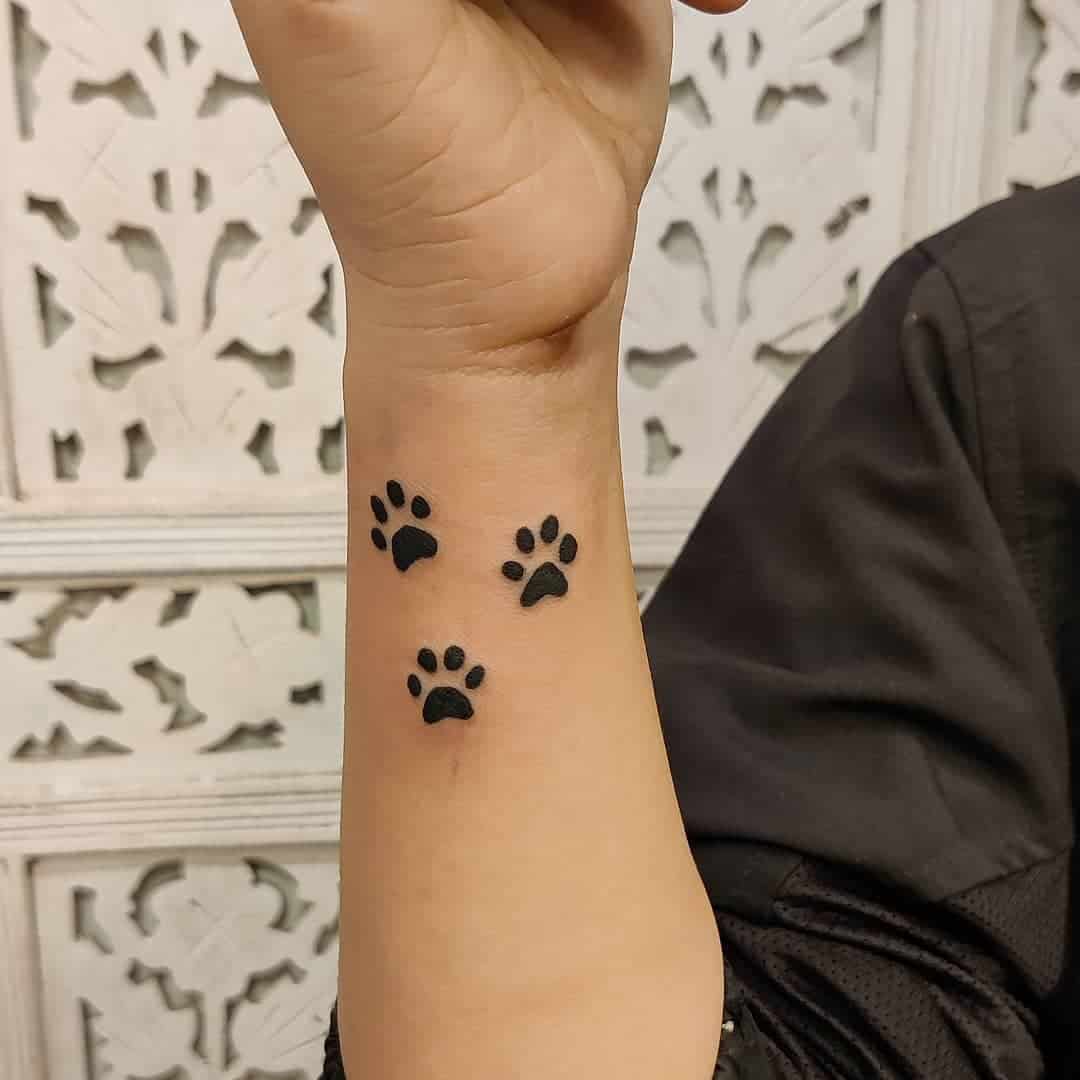 You can’t go wrong with a classic cluster. This design shows three distinct cat paw prints scattered on the wrist. I love that each paw print is done in bold black ink and has a different size, which creates a really playful and cohesive look.