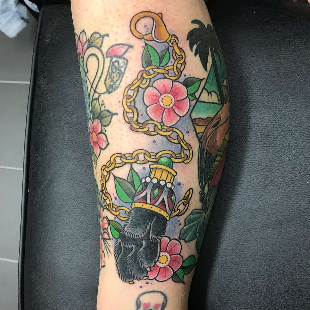 This tattoo is such a showstopper. It features a black cat paw holding a colorful chain, and it’s surrounded by vibrant flowers and greenery.