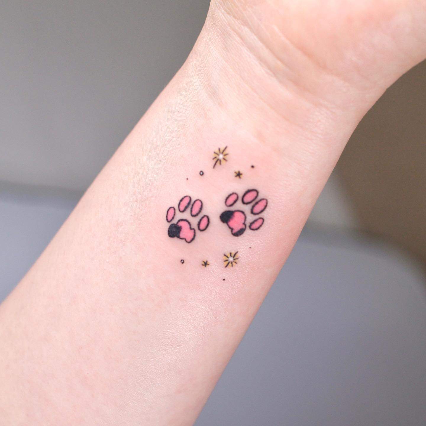 I am obsessed with this one! The tattoo has two different cat paw prints, and each one is highlighted with shades of pink and black.