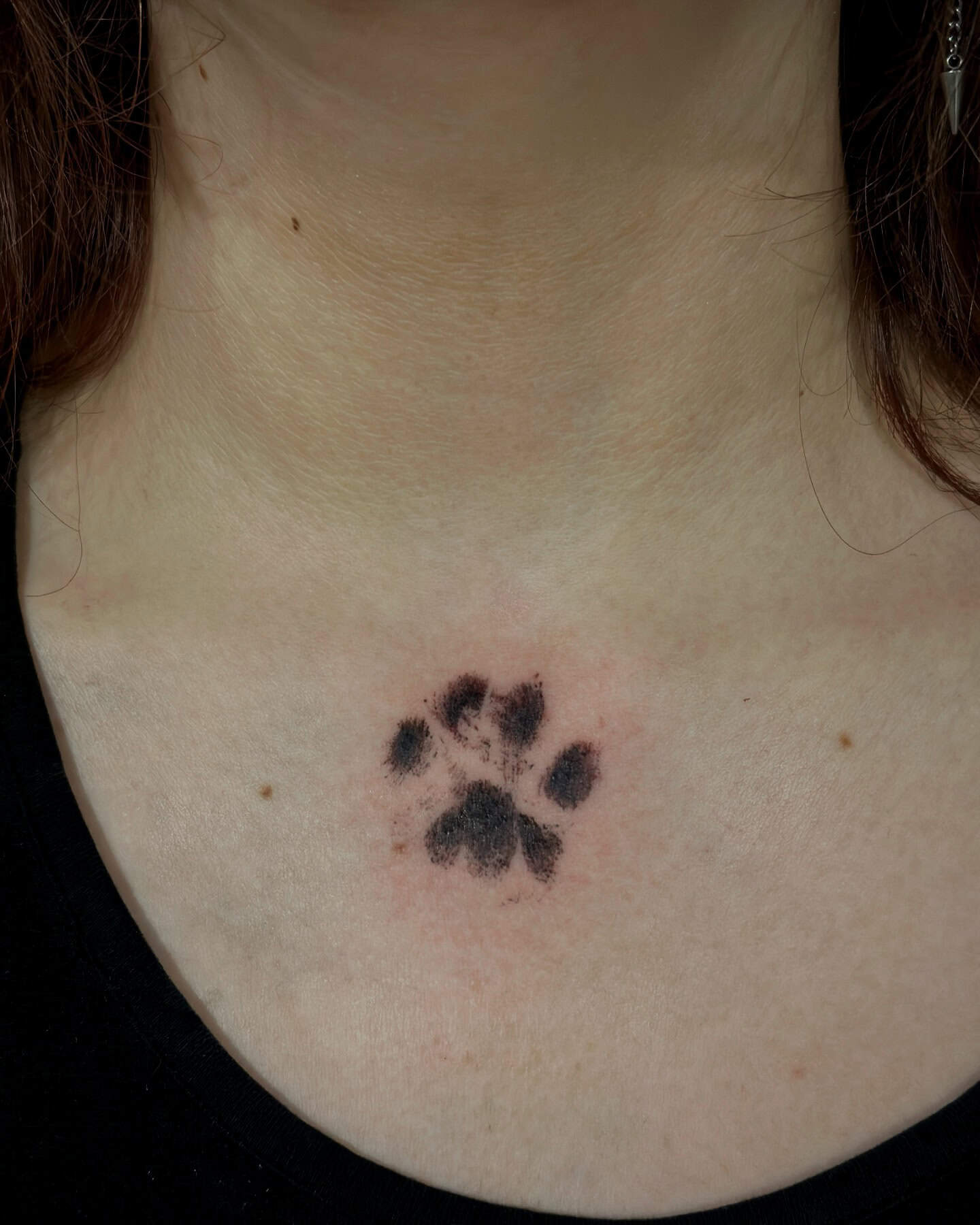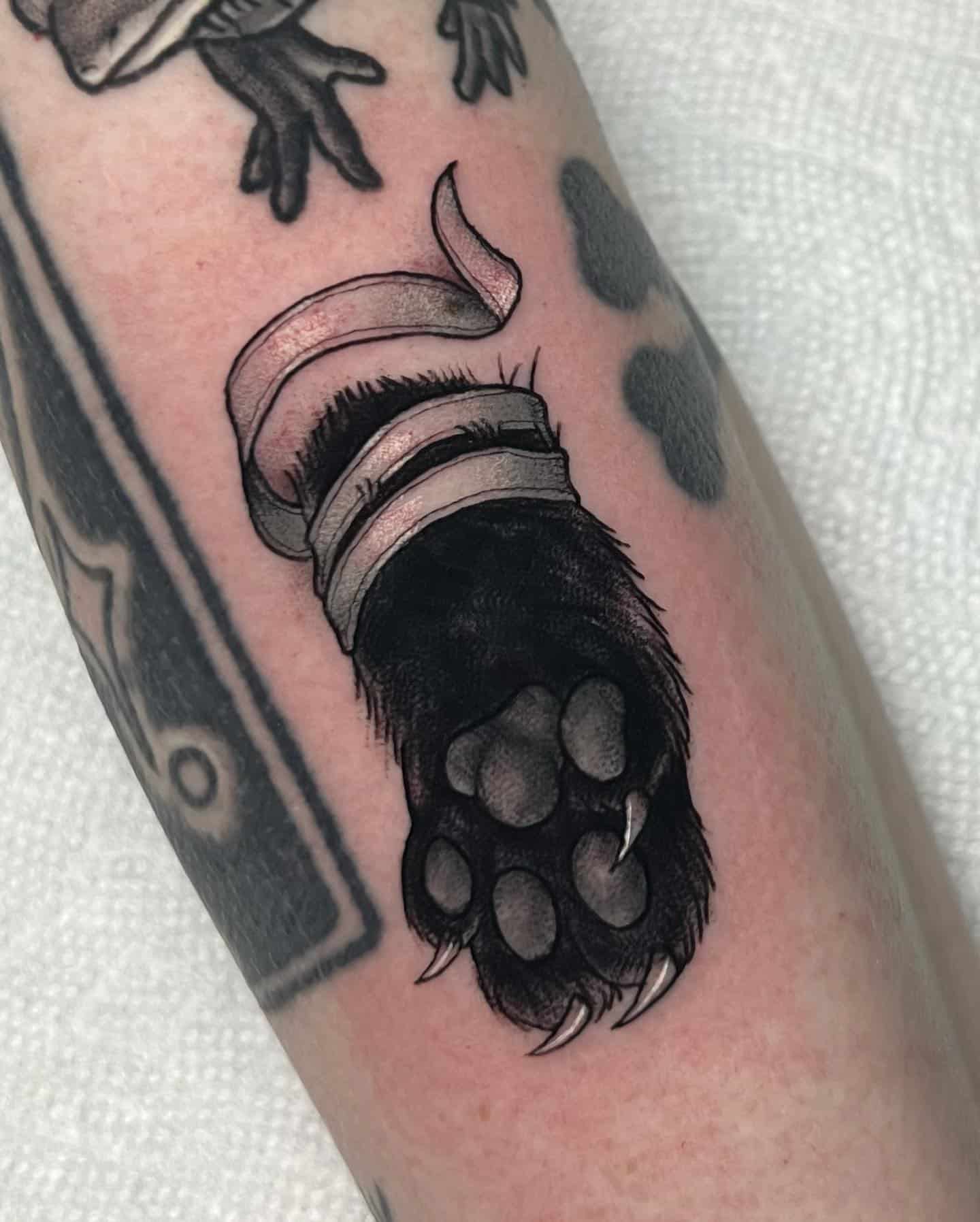 Here’s a look that’s both bold and detailed. This tattoo features a representation of a cat’s paw print with really clear pad shapes and claw outlines.