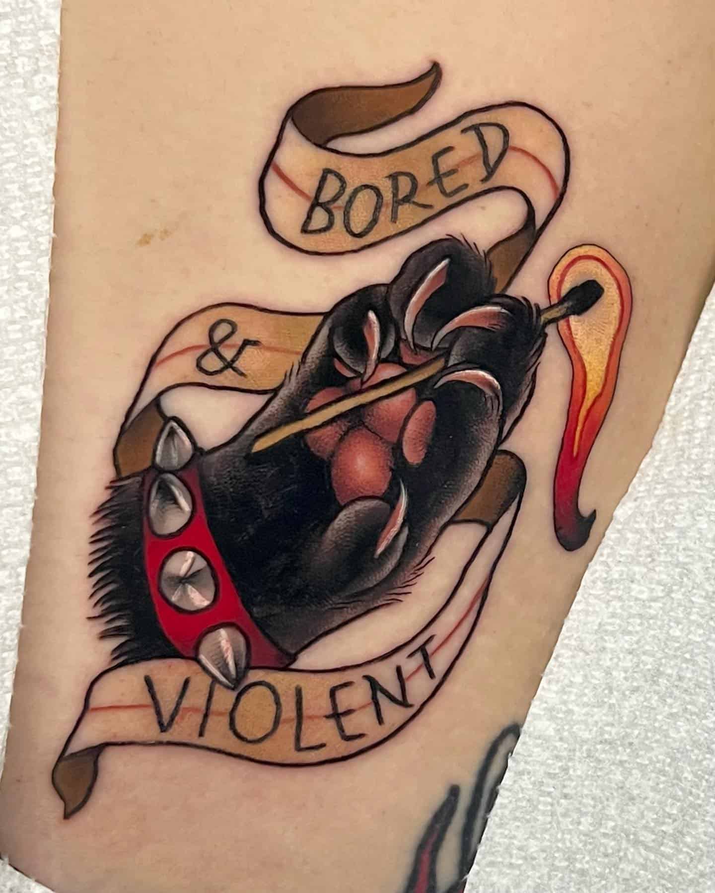 Talk about a tattoo with personality! A detailed black cat paw is shown gripping a matchstick, and it’s surrounded by a ribbon that says “Bored & Violent.”
