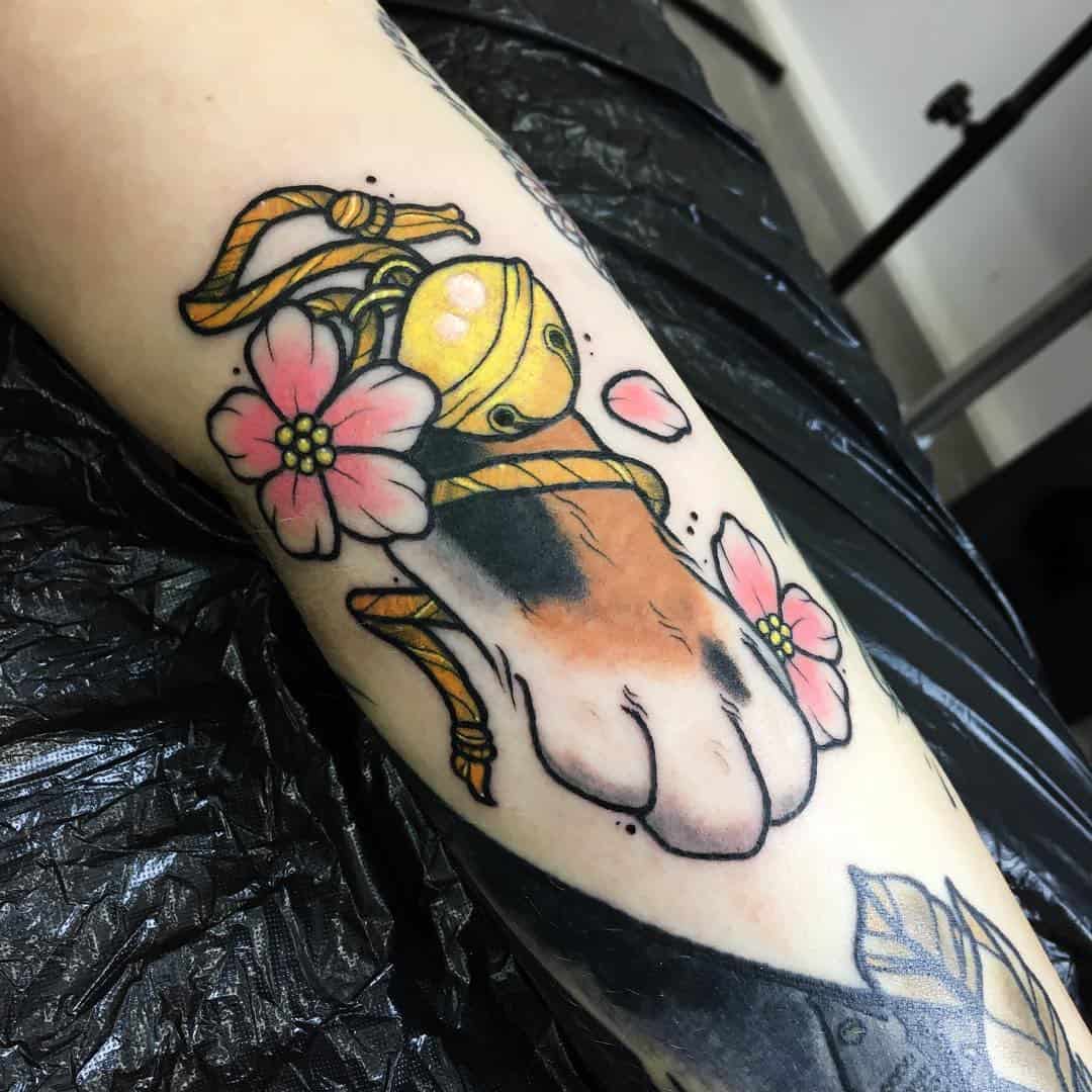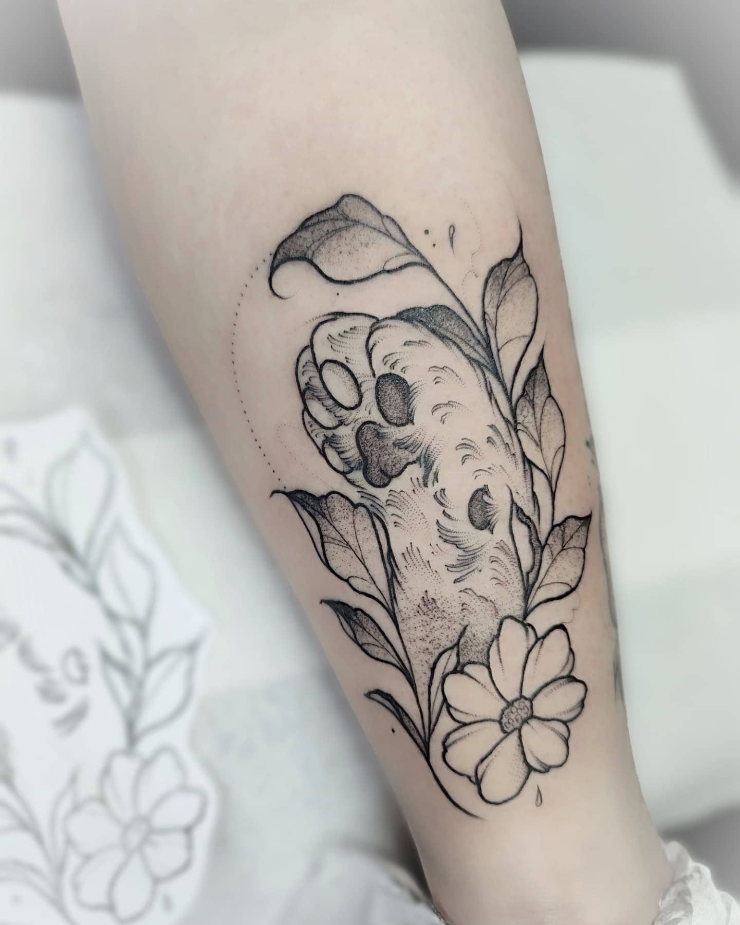 The tattoo mixes bold outlines with soft colors, creating a playful contrast that highlights the paw’s details while working perfectly with the floral touches.