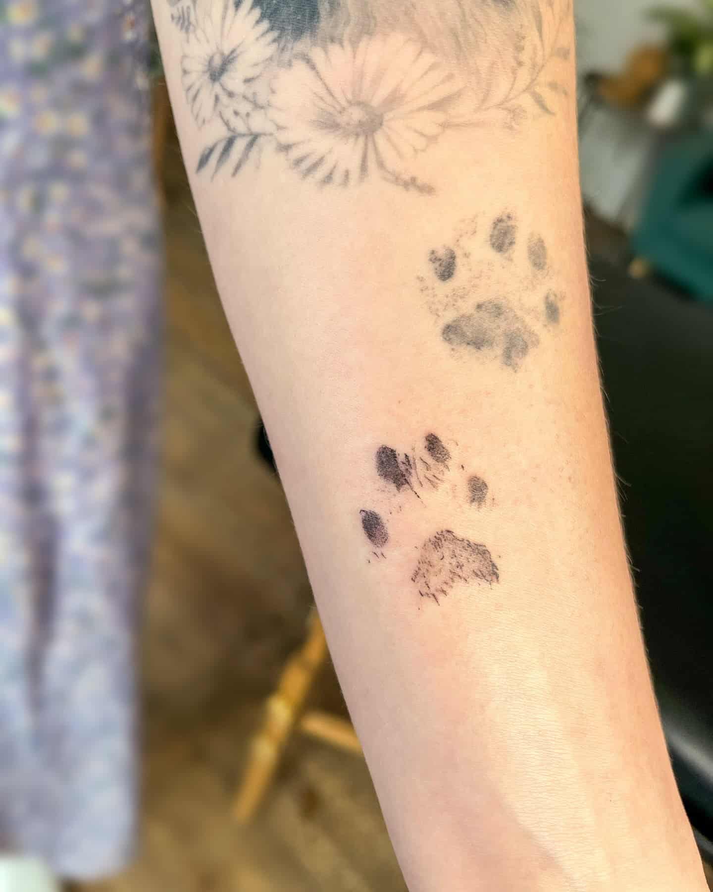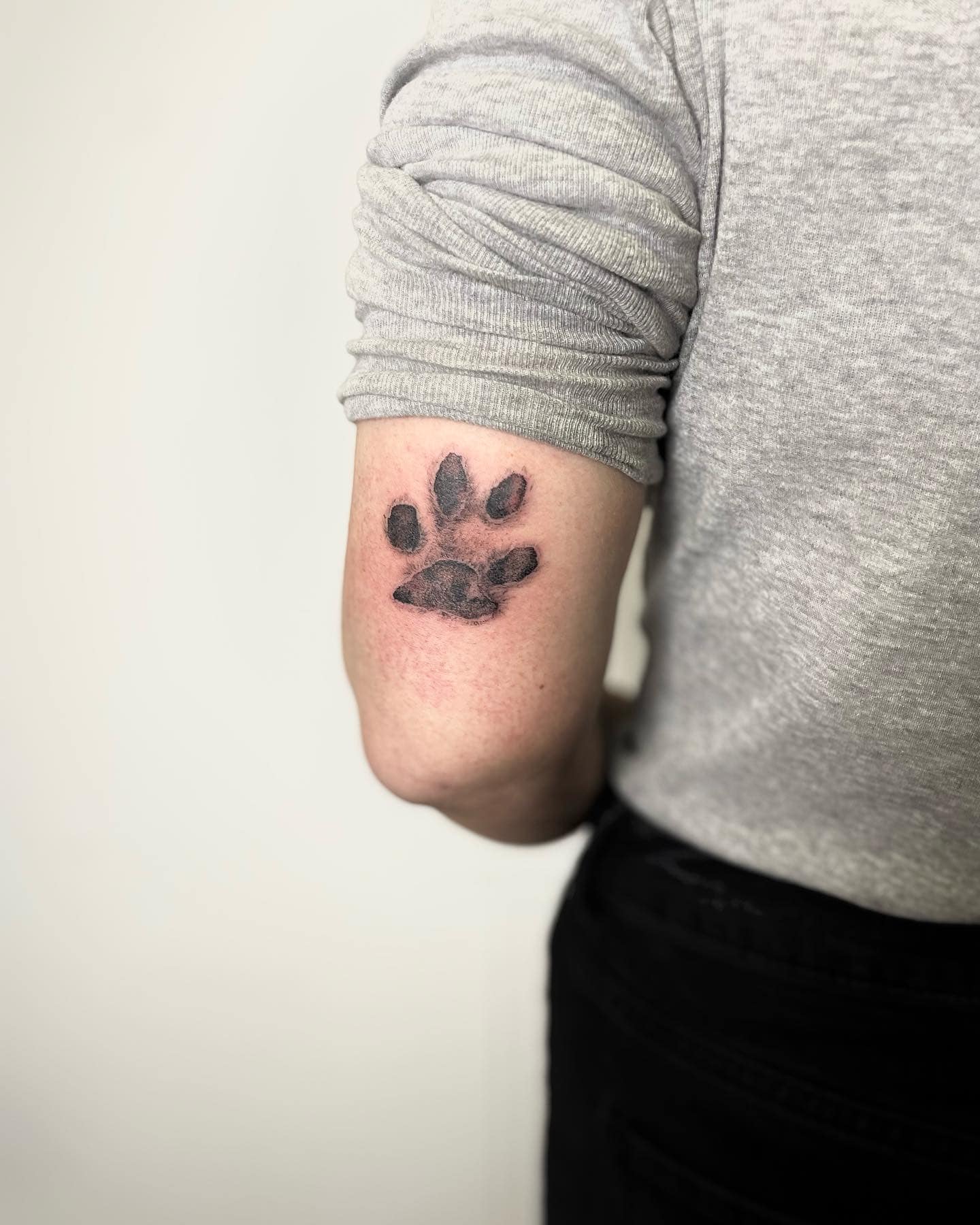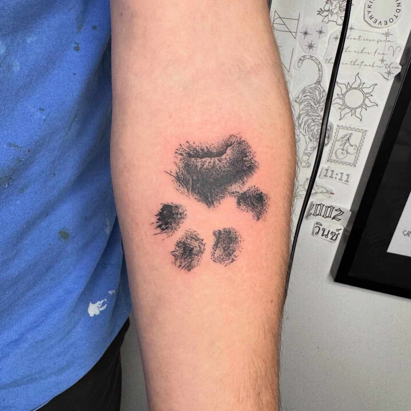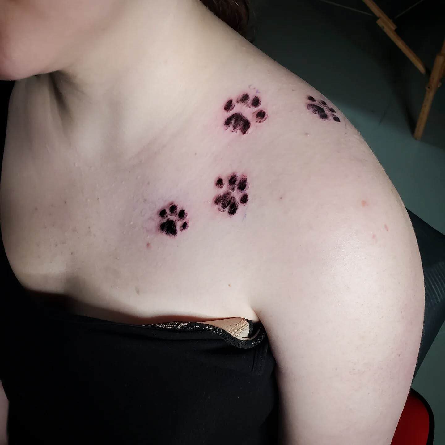 The use of deep black ink contrasted with soft shading creates a realistic effect, giving the feeling of paw prints gently pressed onto the skin.