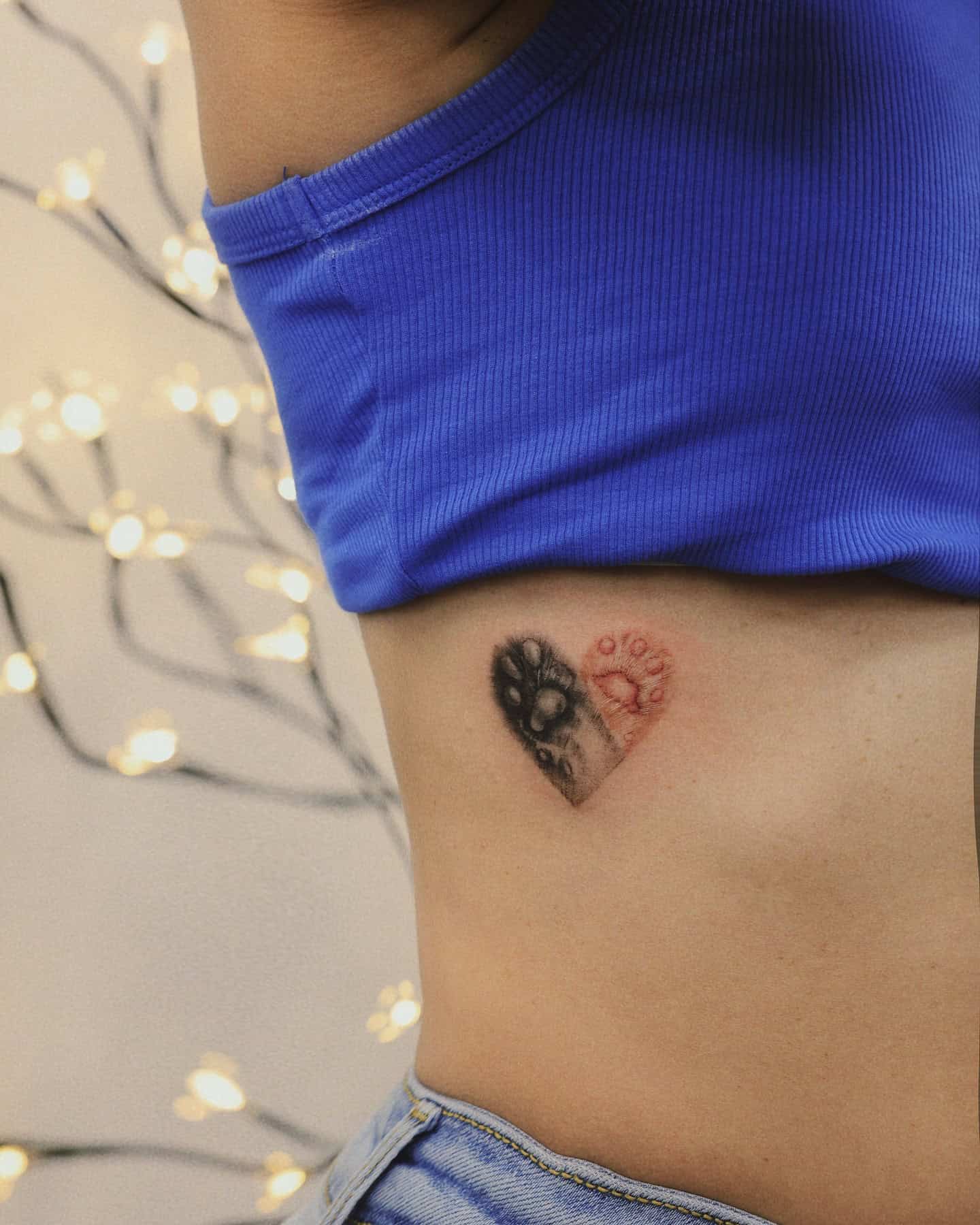 Say no more. This tattoo features a heart shape that’s made from two distinct cat paw prints, one in a deep black and the other in a soft pink.