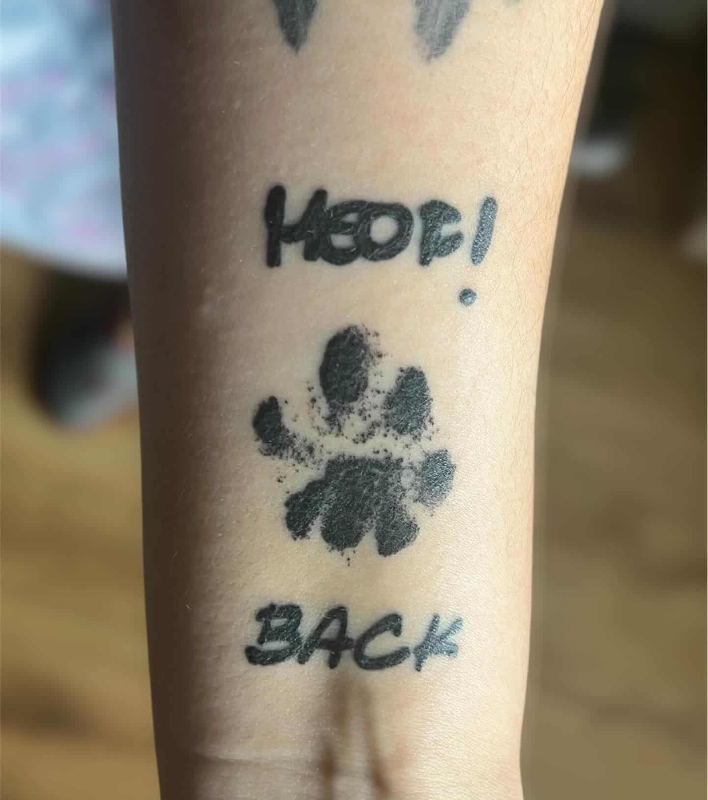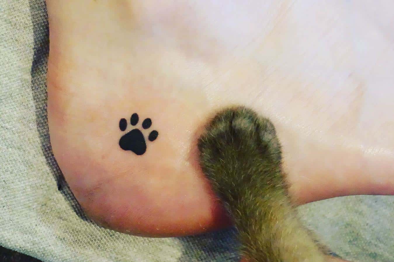 Okay, this is just too cute. A clear, black cat paw tattoo is shown on the skin, and it’s made even better with a real cat’s paw placed right next to it.