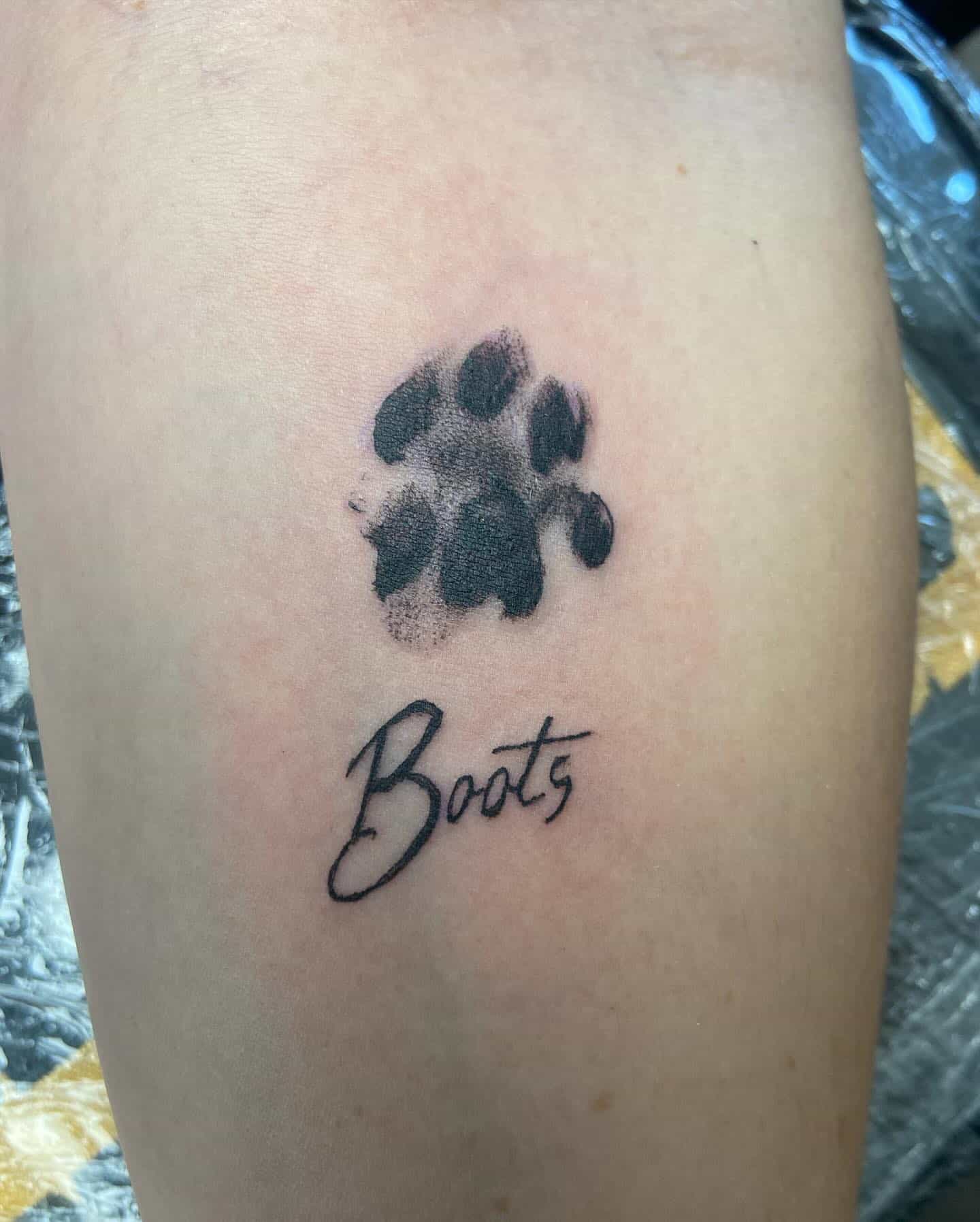 Adding a name is always such a sweet touch. This tattoo features a prominent cat paw print that is richly shaded in black, showing off the distinct toe pads and a rounded shape.