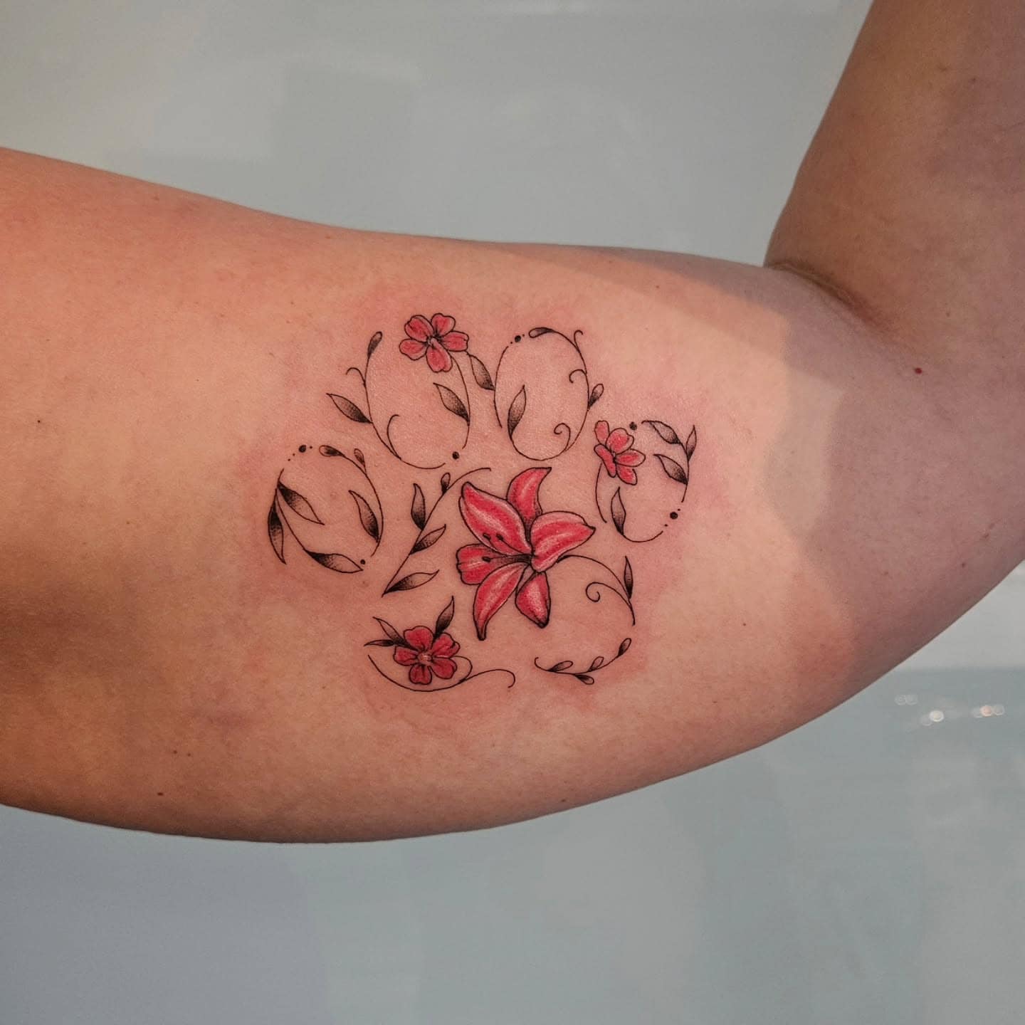 How cute is this idea? The tattoo takes a cat paw shape and fills it with sweet flowers and leaves, using vibrant red and soft black outlines.