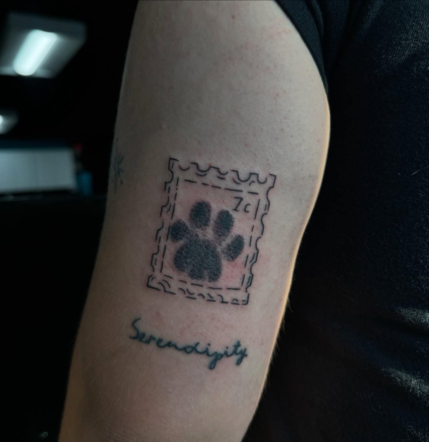 Okay, how creative is this? The tattoo features a paw print that’s designed to look like a postage stamp, and it even has intricate outlines.