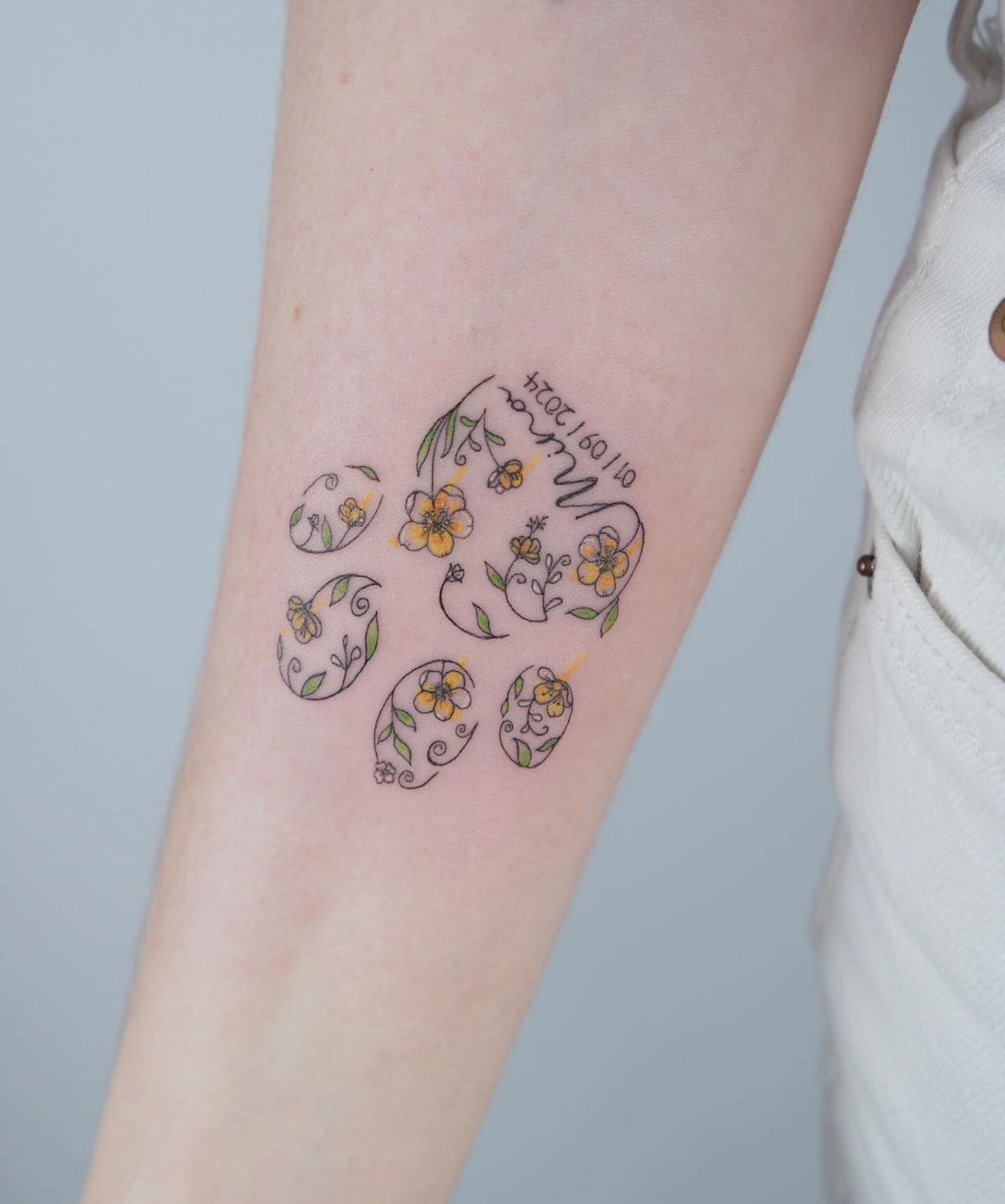 For a whimsical take, this tattoo features a cat paw shape that’s filled with delicate floral patterns and bright yellow flowers. The intricate details combine playful elements with a soft color palette, giving it a really whimsical appearance.