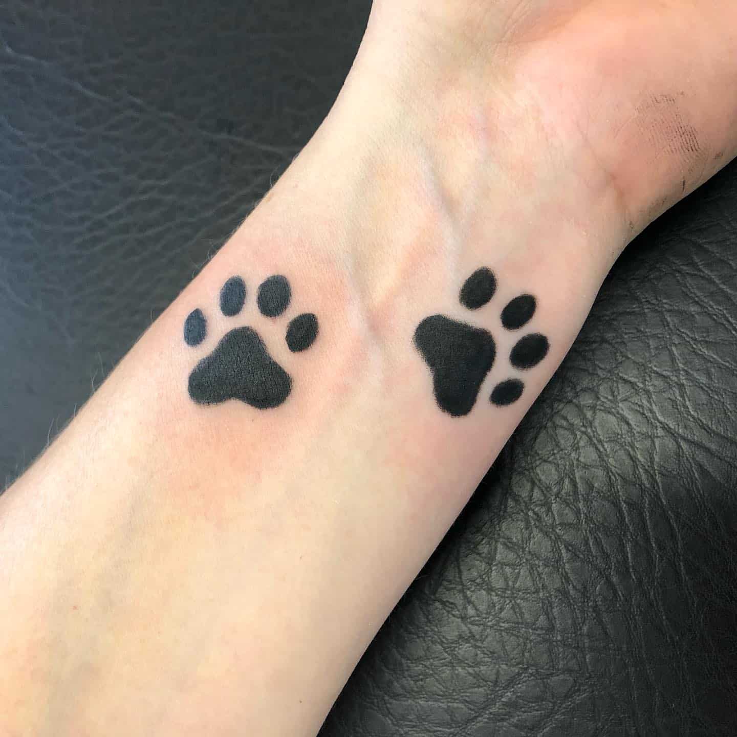 There’s something so satisfying about a symmetrical design. Two distinct cat paw prints are inked on the wrist, showing a clean and bold black silhouette.
