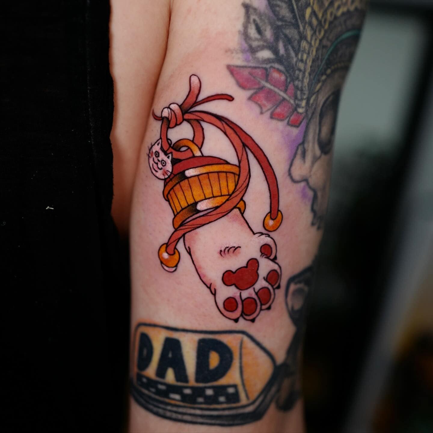 I’m so into this one! The tattoo shows a cat paw surrounded by colorful yarn and a super cute cat face, making for such an engaging little scene.