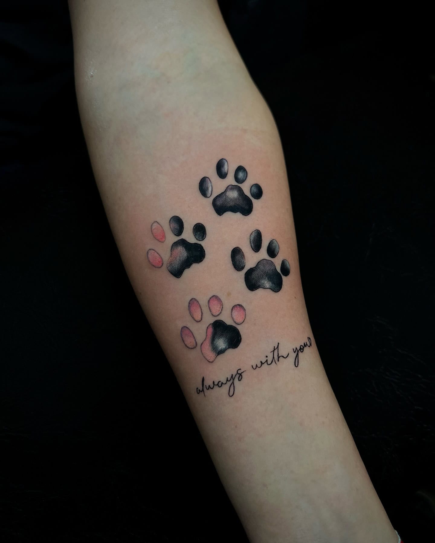 The use of shading and color gives it a three dimensional effect, enhancing the lifelike appearance of the paw prints. And the cursive phrase “always with you” adds such a personal touch.