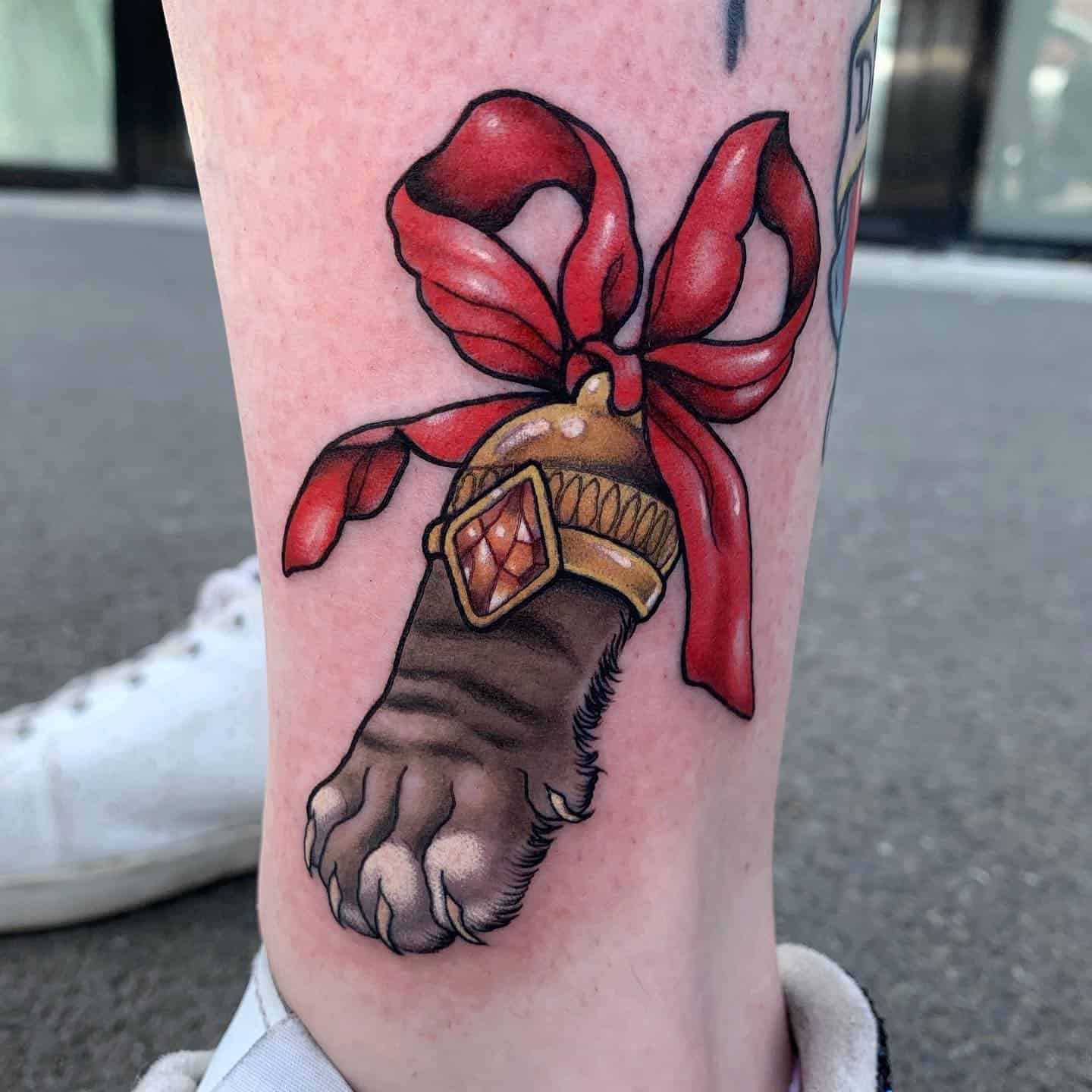 This tattoo is just so festive and fun! It features a cat’s paw decorated with a bright red ribbon and a golden bell, which gives it a really playful appearance.