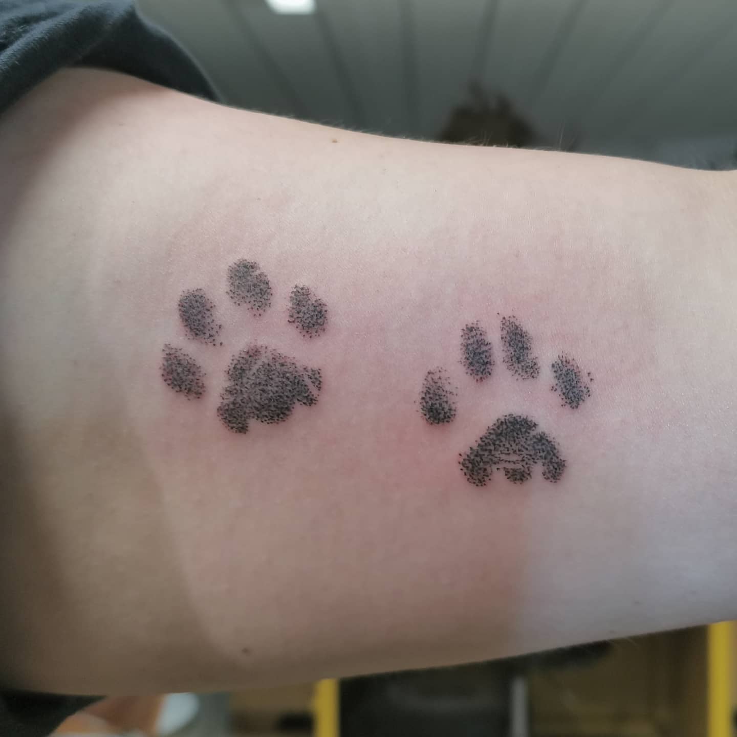 This is such a cool technique. The tattoo shows two cat paw prints made using a dot work style that gives them a textured, shaded appearance.