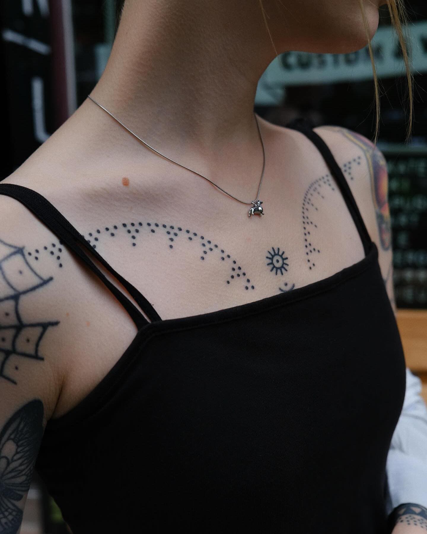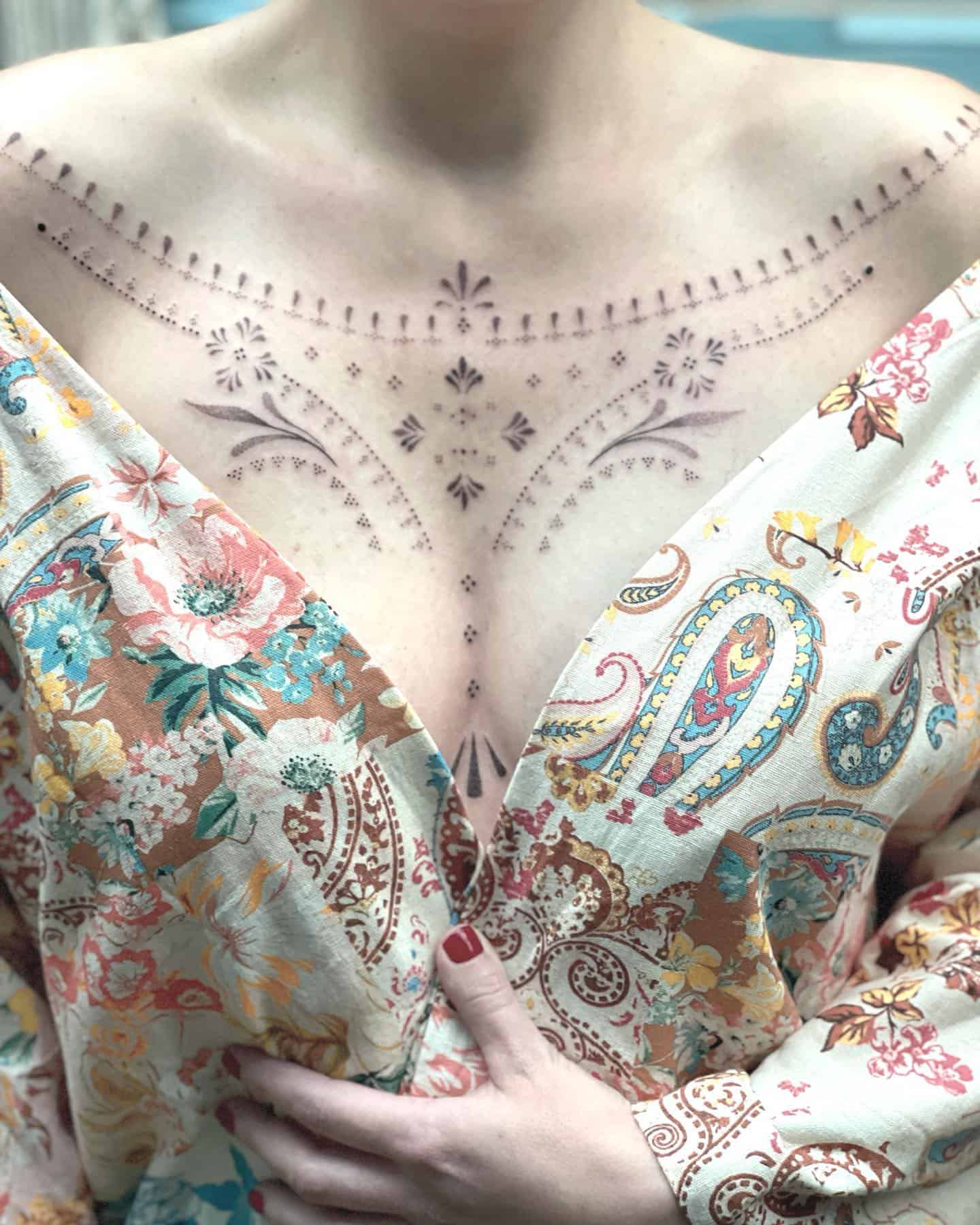 The delicate lines and shapes form a captivating contrast with the soft material of the blouse. For anyone thinking about getting a chest tattoo, finding a design that mirrors your personal style is what can make it feel truly special.