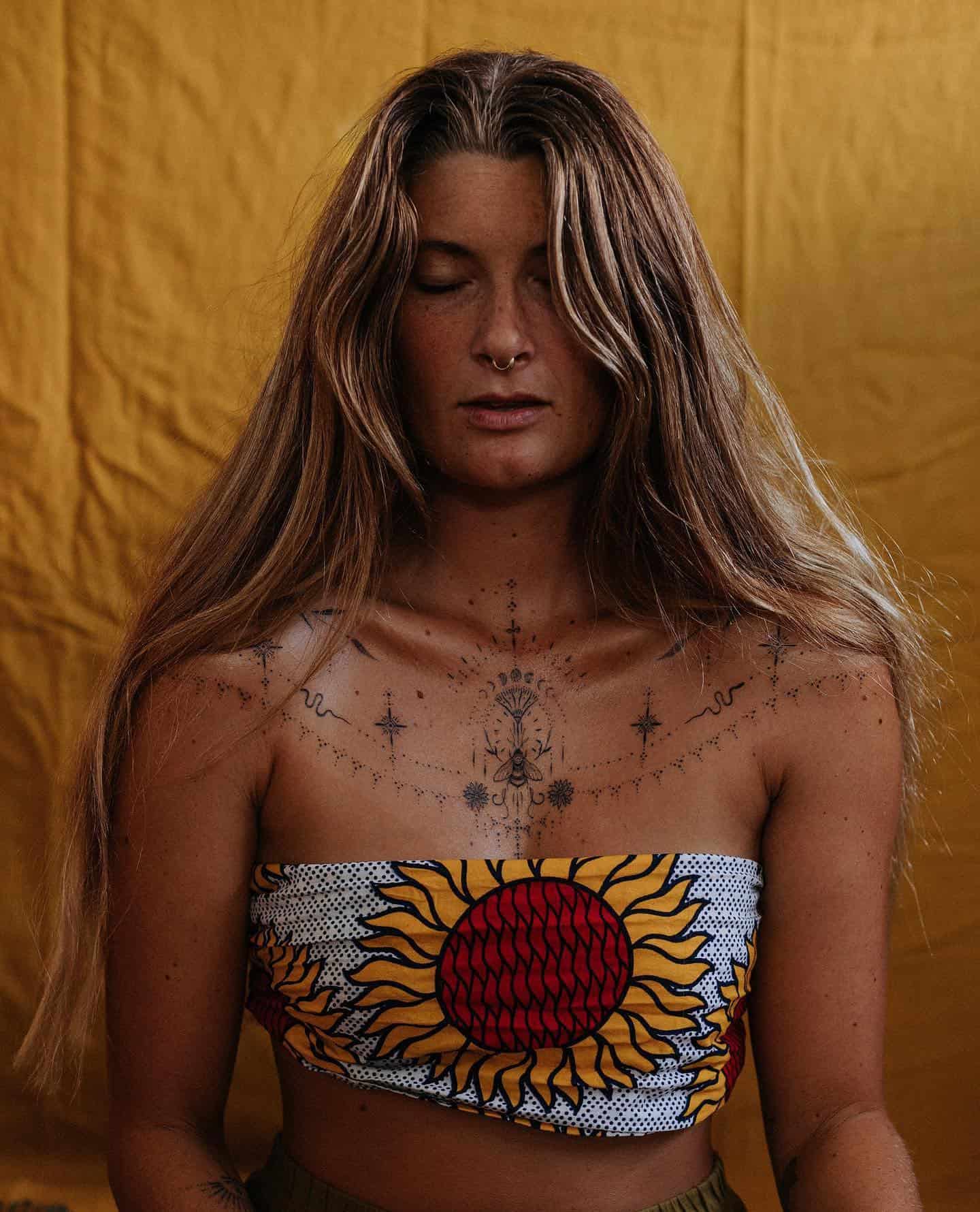 I feel like I’d get some serious compliments on this one. This image shows a woman with stunning chest tattoos that blend so beautifully with her vibrant outfit.