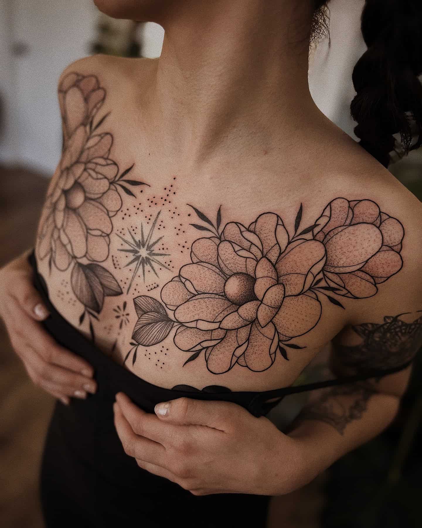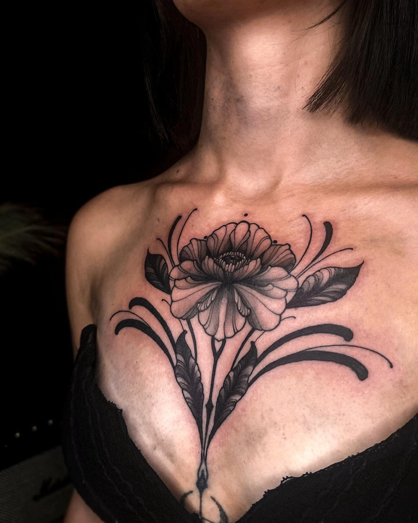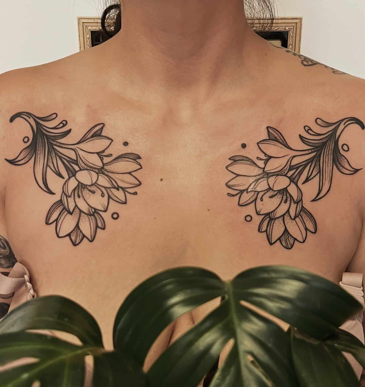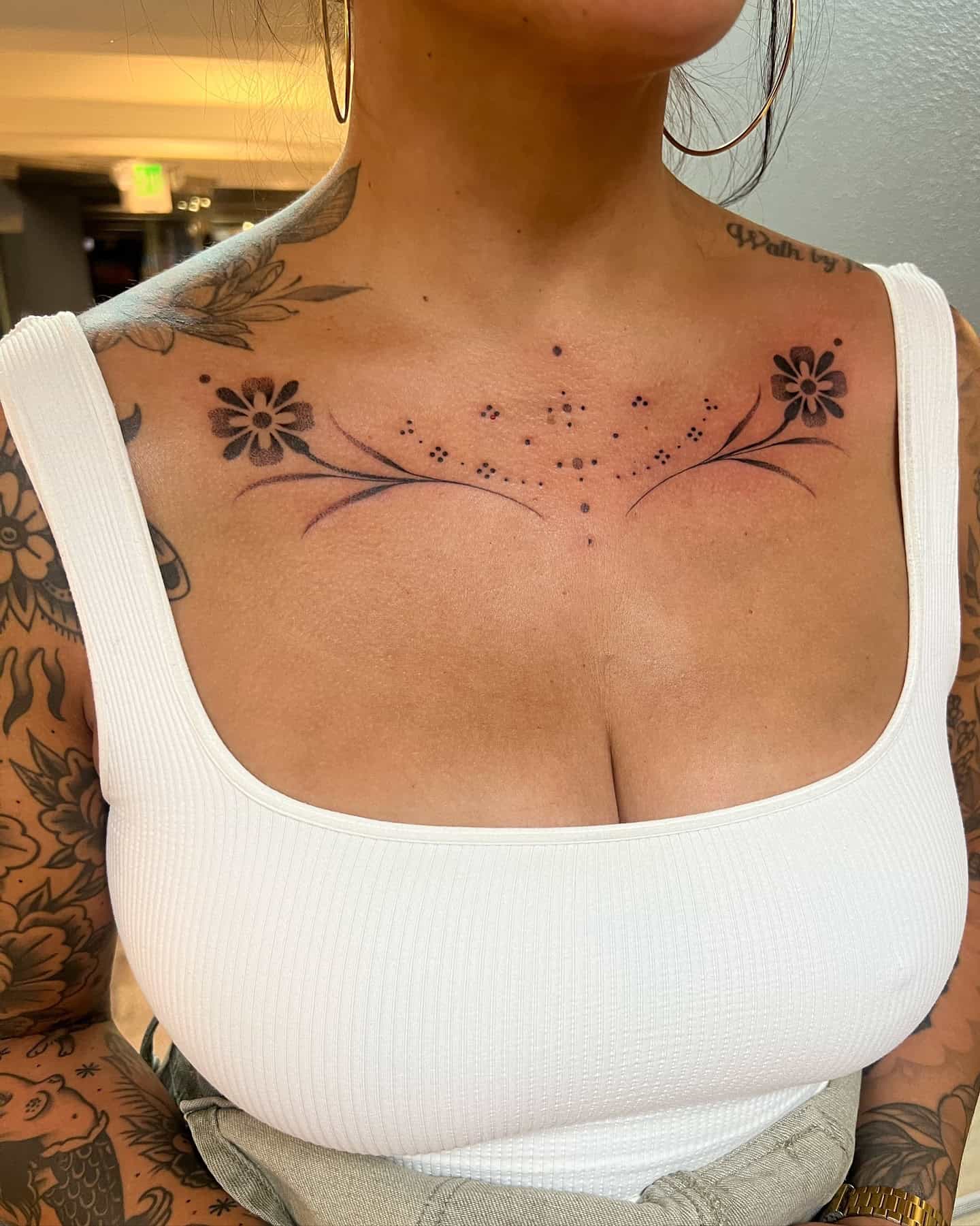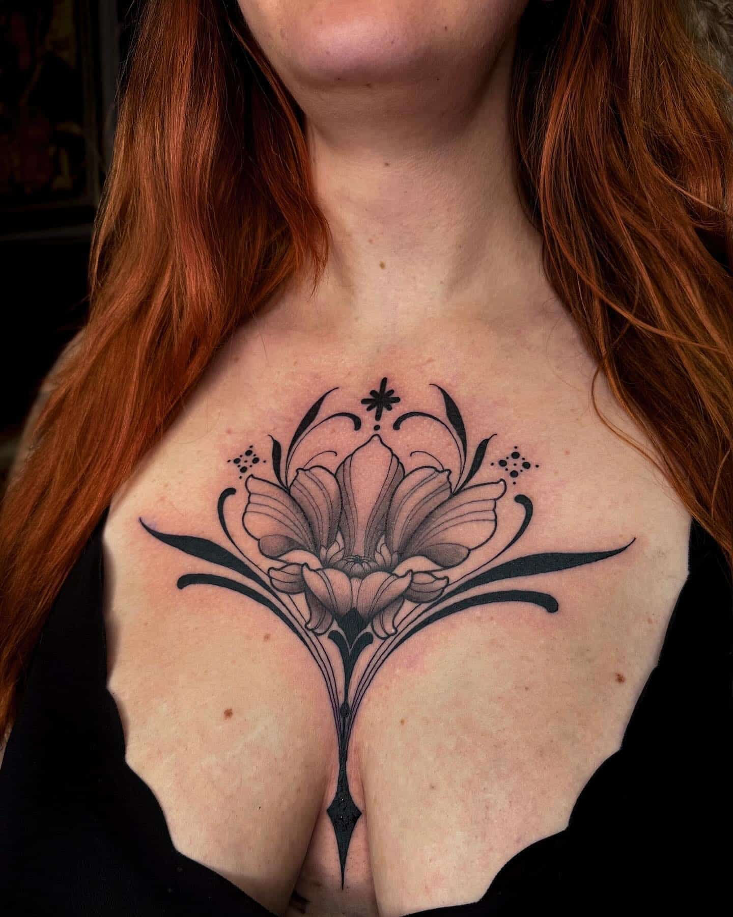This picture is just so stunning. It showcases a gorgeous floral tattoo that decorates a woman’s chest so gracefully, blending pure artistry with personal expression.