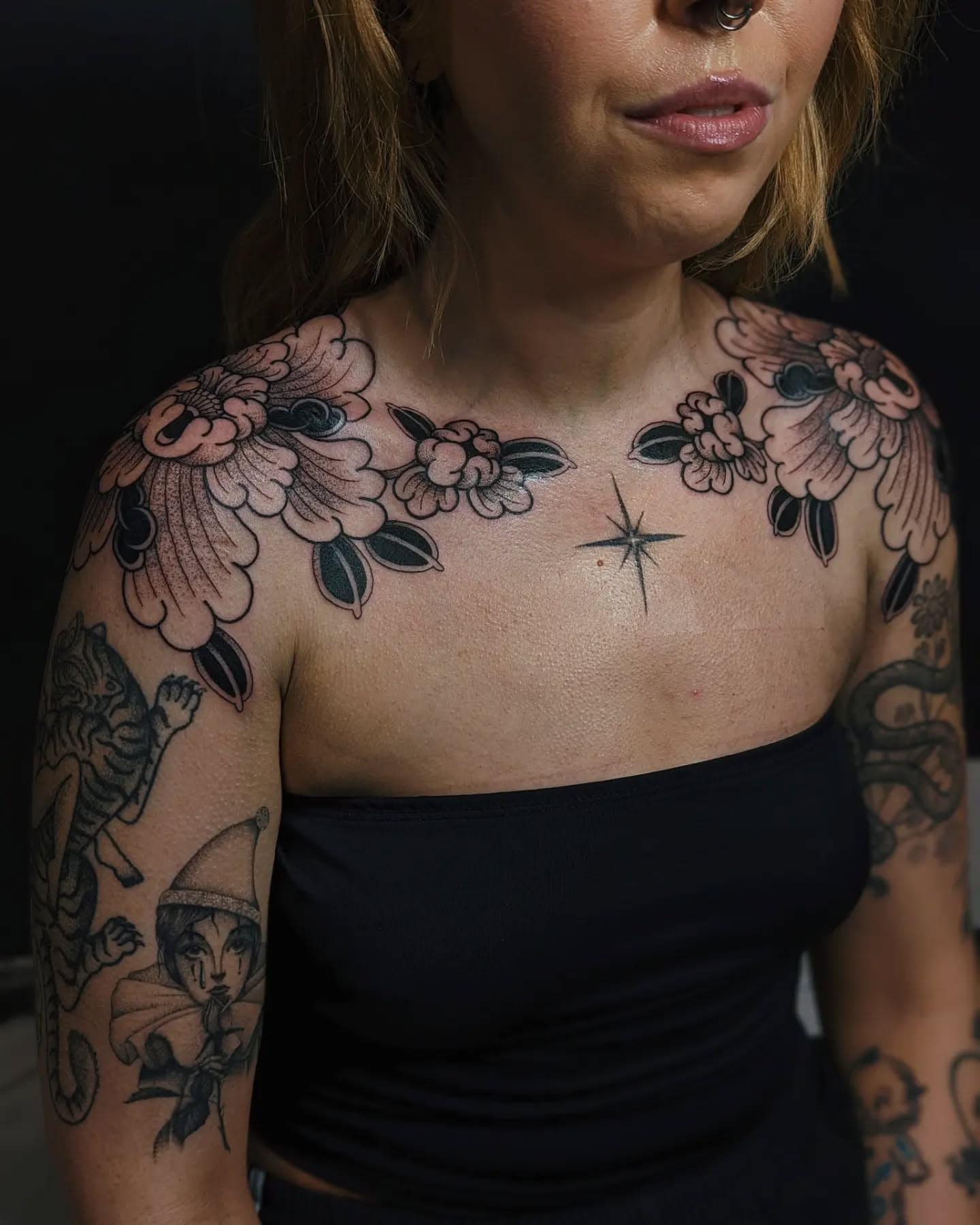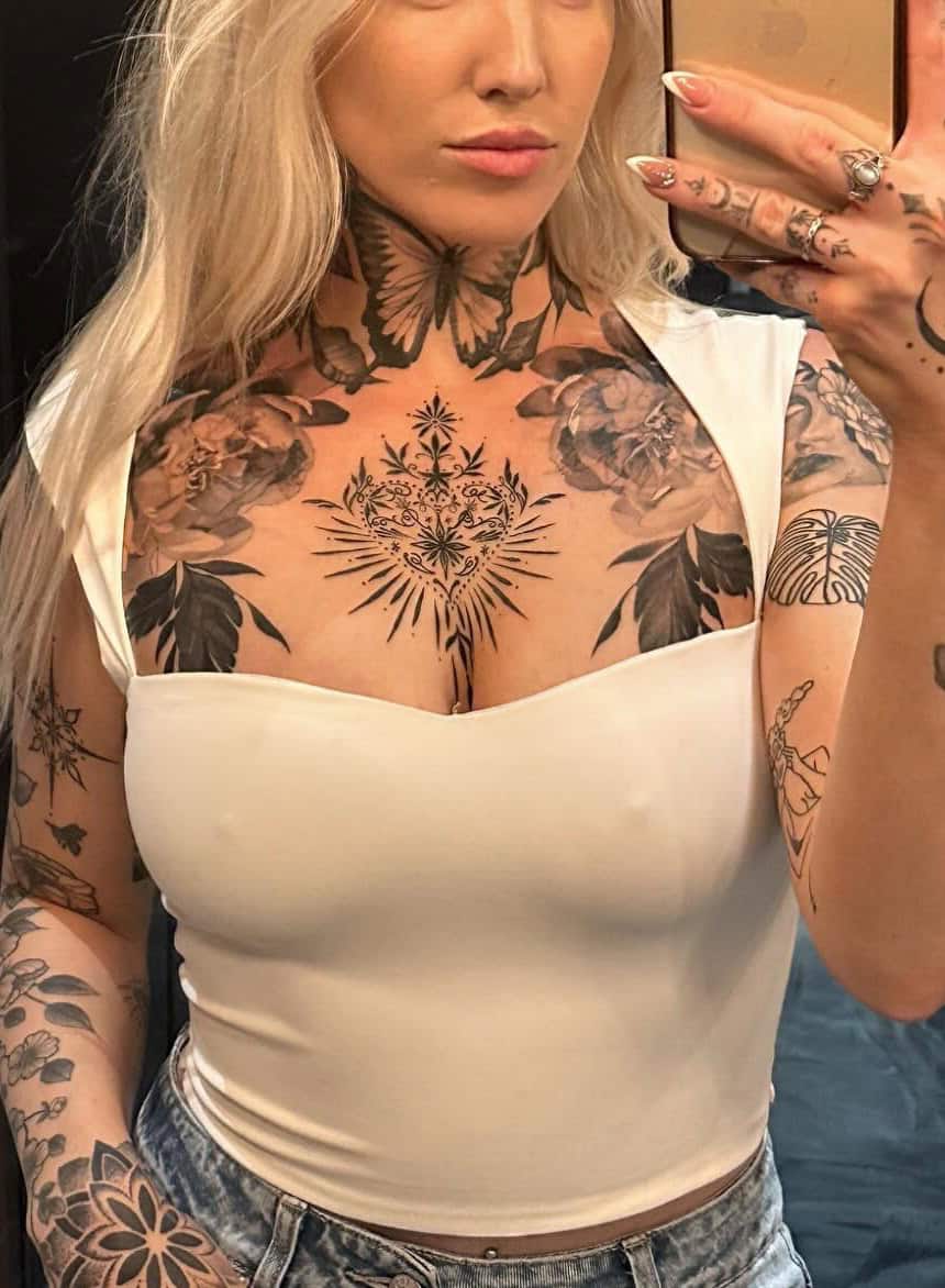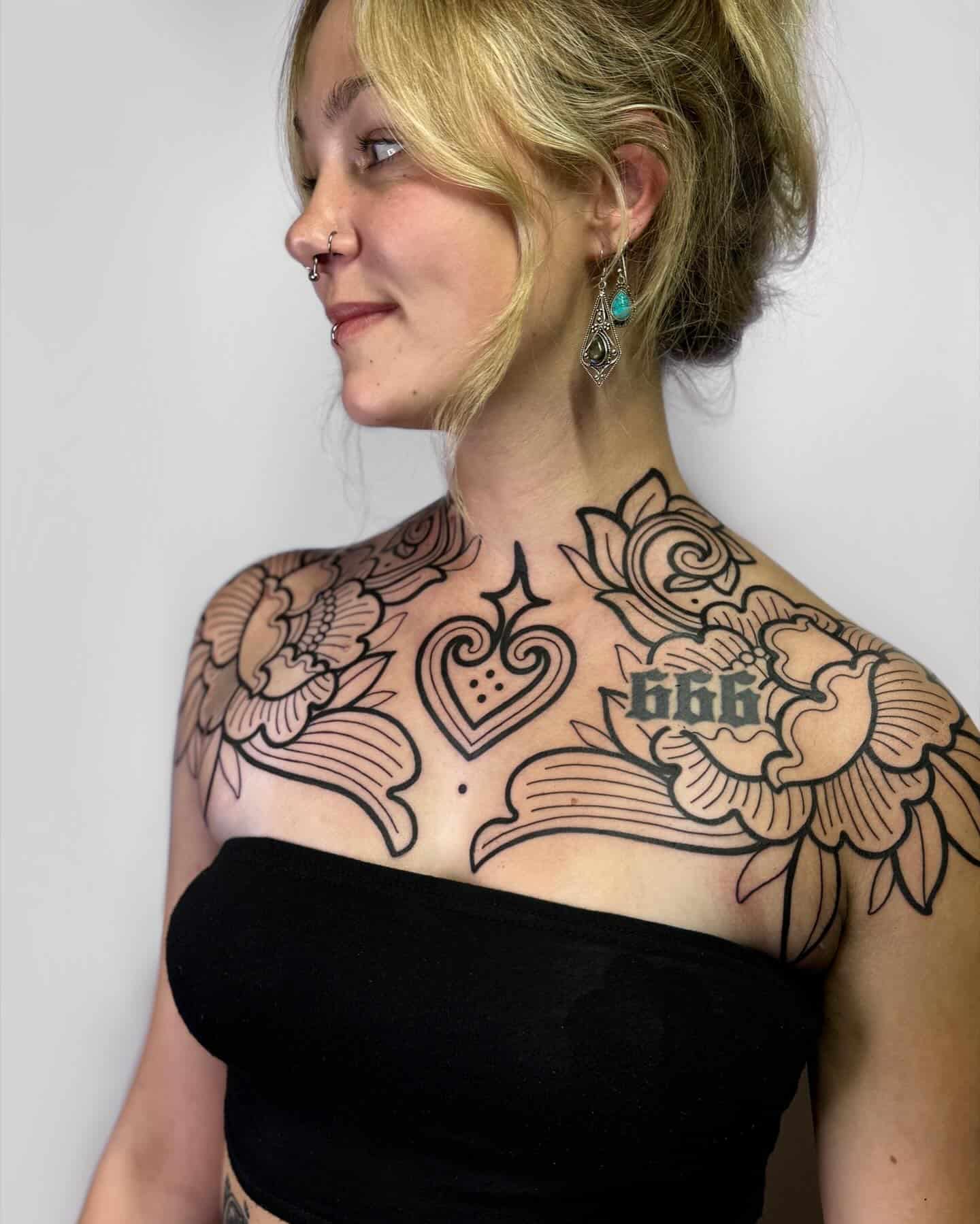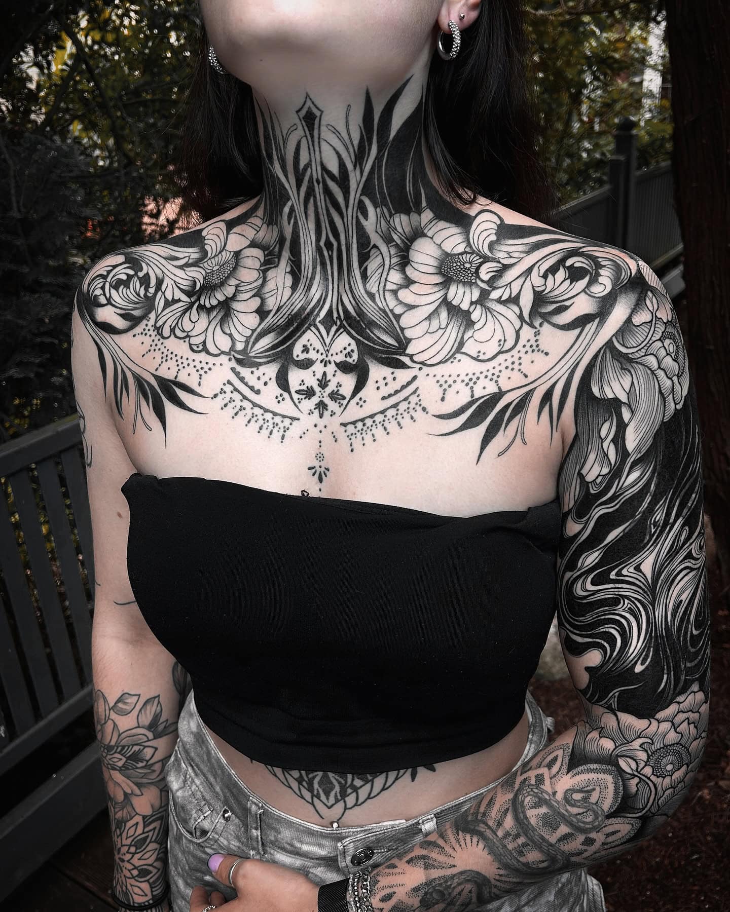 I just love everything about this look. This image features a woman showing off her incredible chest tattoos, with detailed floral designs that flow so gracefully around her shoulders.