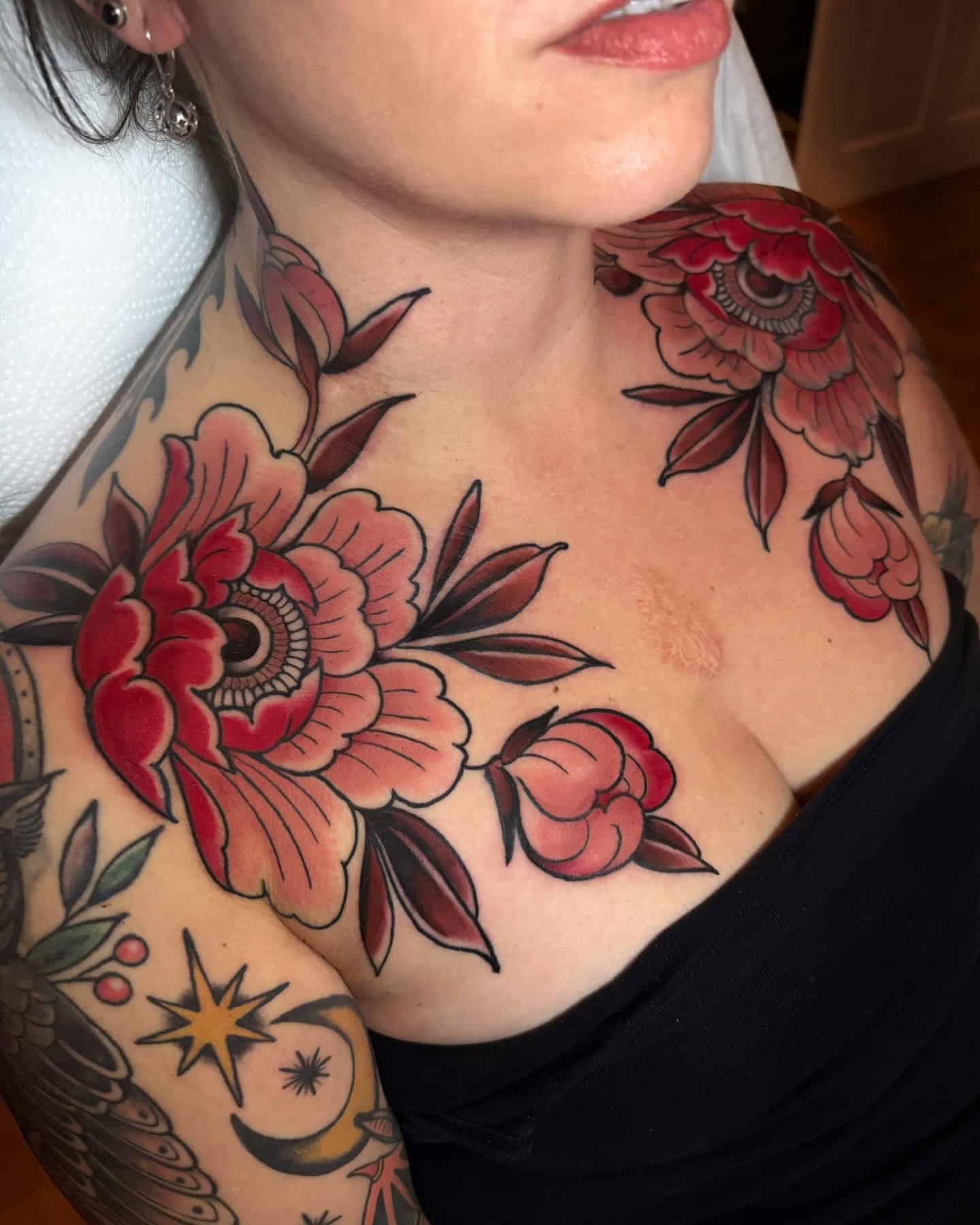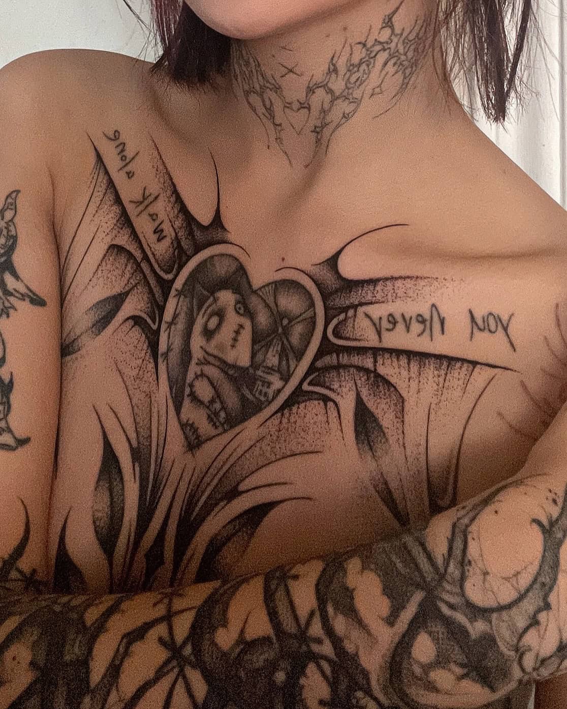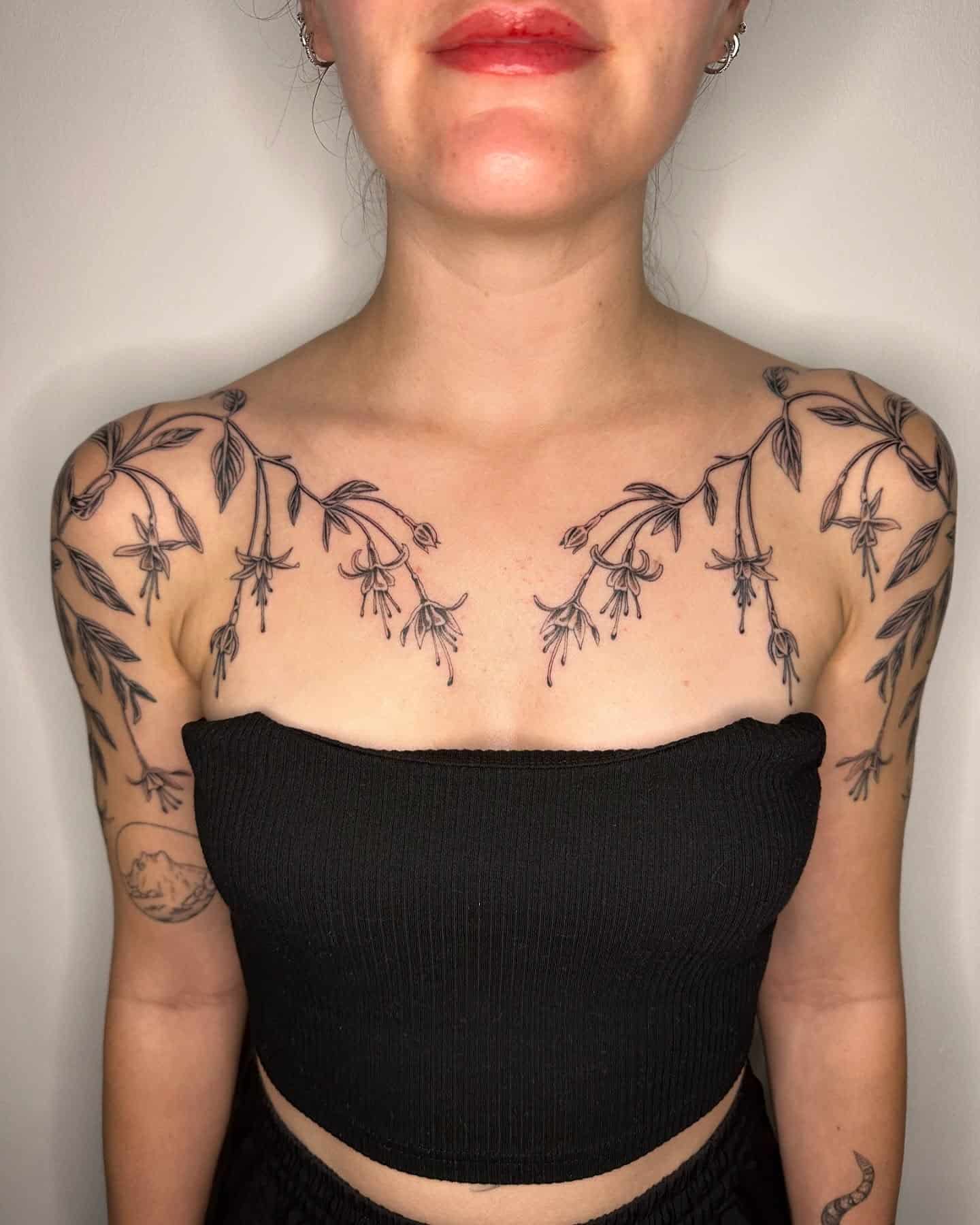 I just love everything about this look. This image features a woman showing off her incredible chest tattoos, with detailed floral designs that flow so gracefully around her shoulders.