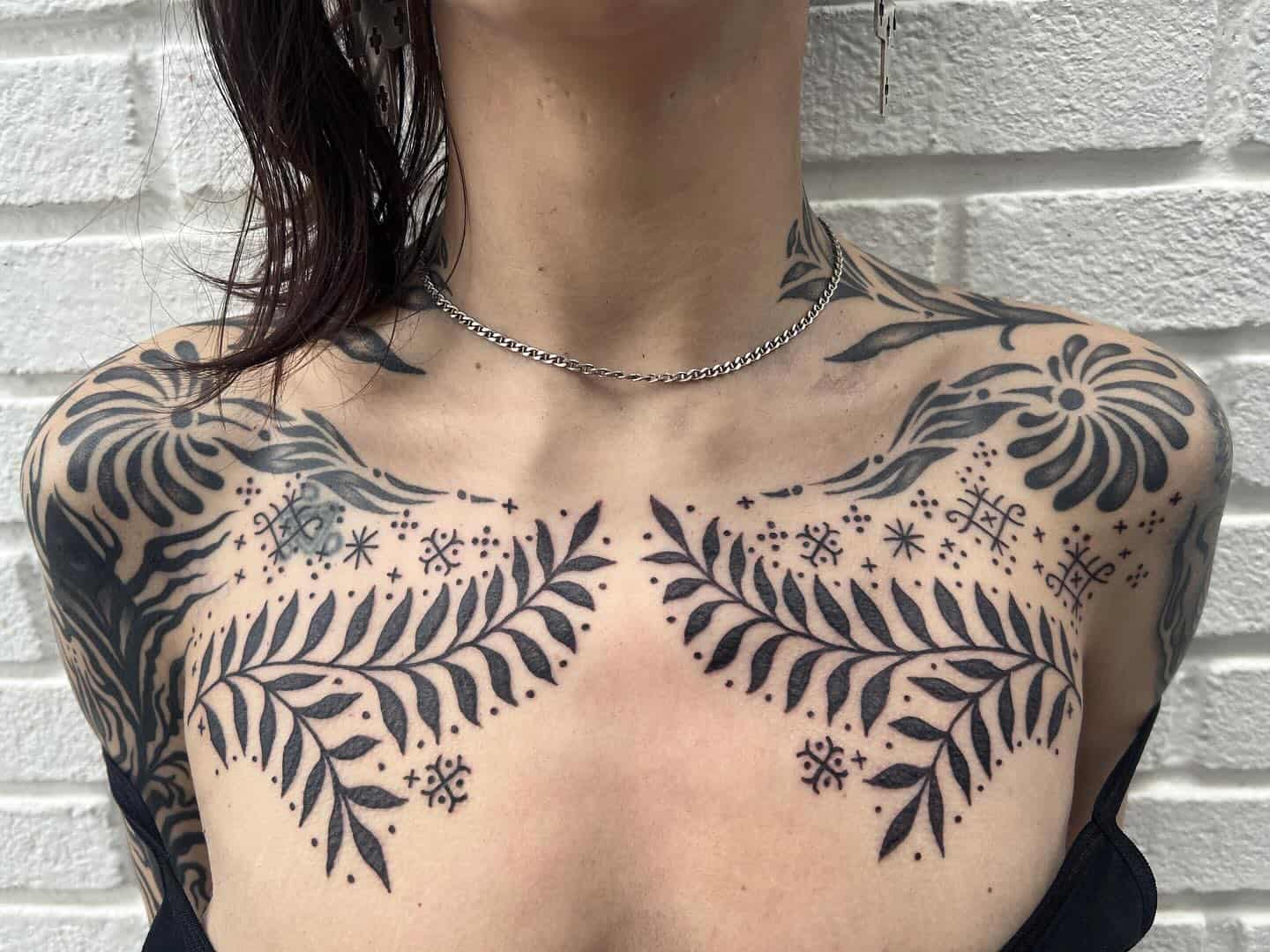 I am a big fan of this bold style. This striking image shows off a beautiful chest tattoo that features intricate floral and fern designs. The bold black ink creates a perfect contrast with the skin, which results in a stunning visual impact.