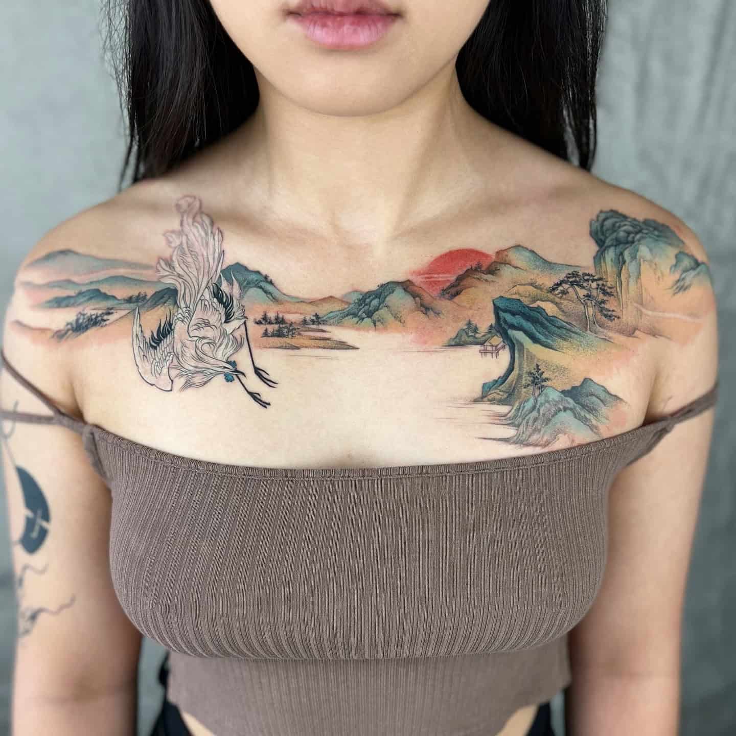 For all the nature lovers out there, this one’s for you. This stunning tattoo has a beautiful landscape that flows so gracefully across the chest, bringing the beauty of nature to life.