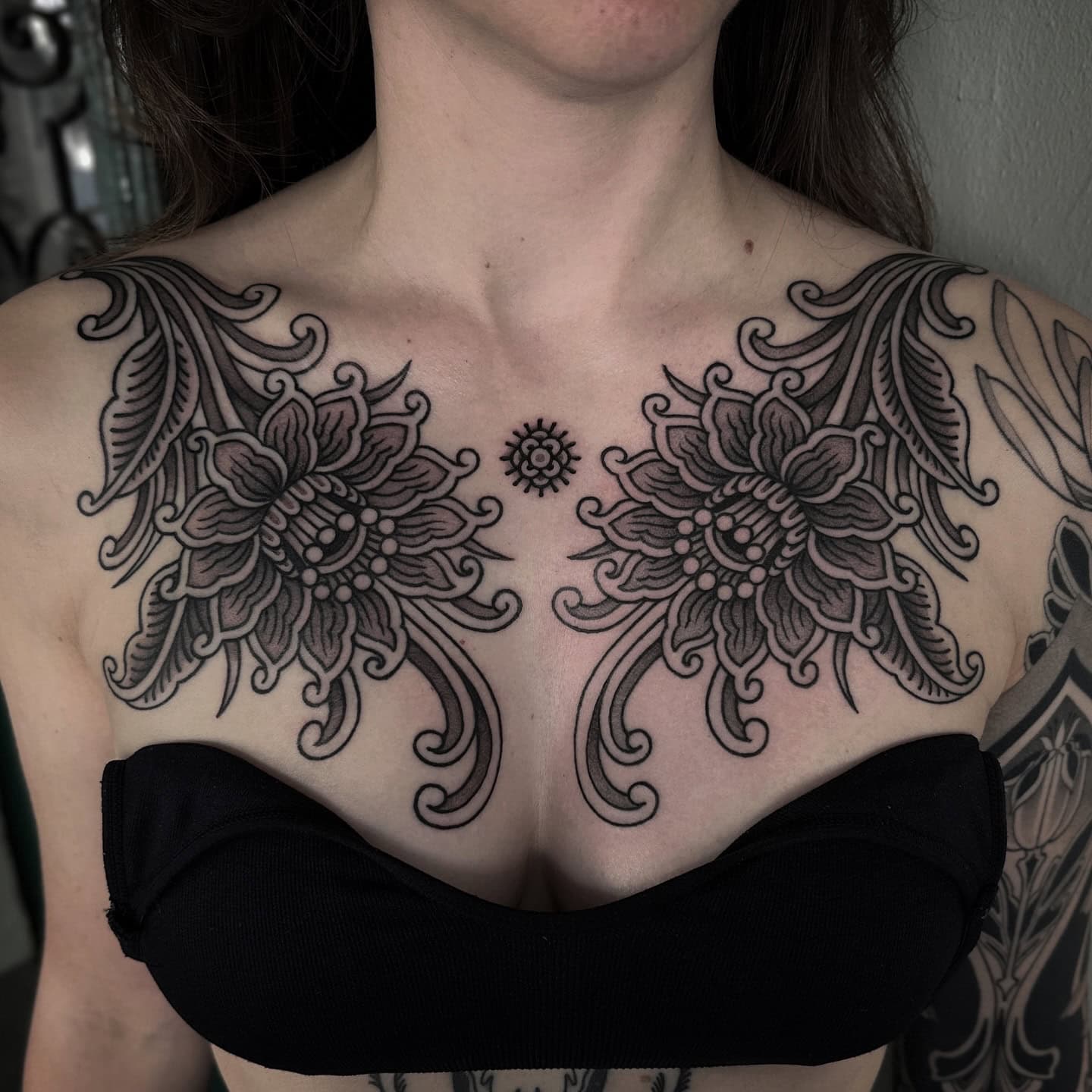 I’ve been loving this style lately. This image puts a stunning chest tattoo on display that beautifully blends intricate floral patterns with some delicate dot work.