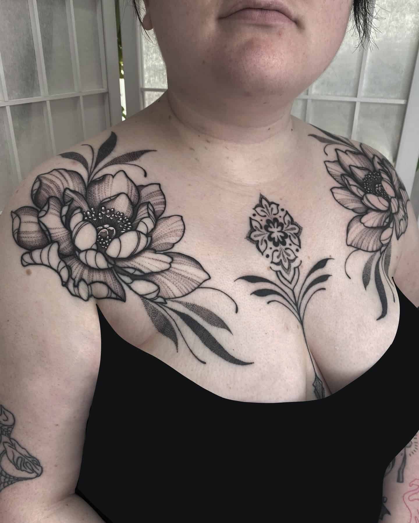 This striking image shows off some beautifully detailed floral tattoos that adorn the chest so gracefully. The intricate designs are a perfect mix of elegance and a touch of nature, which makes for a really powerful statement.
