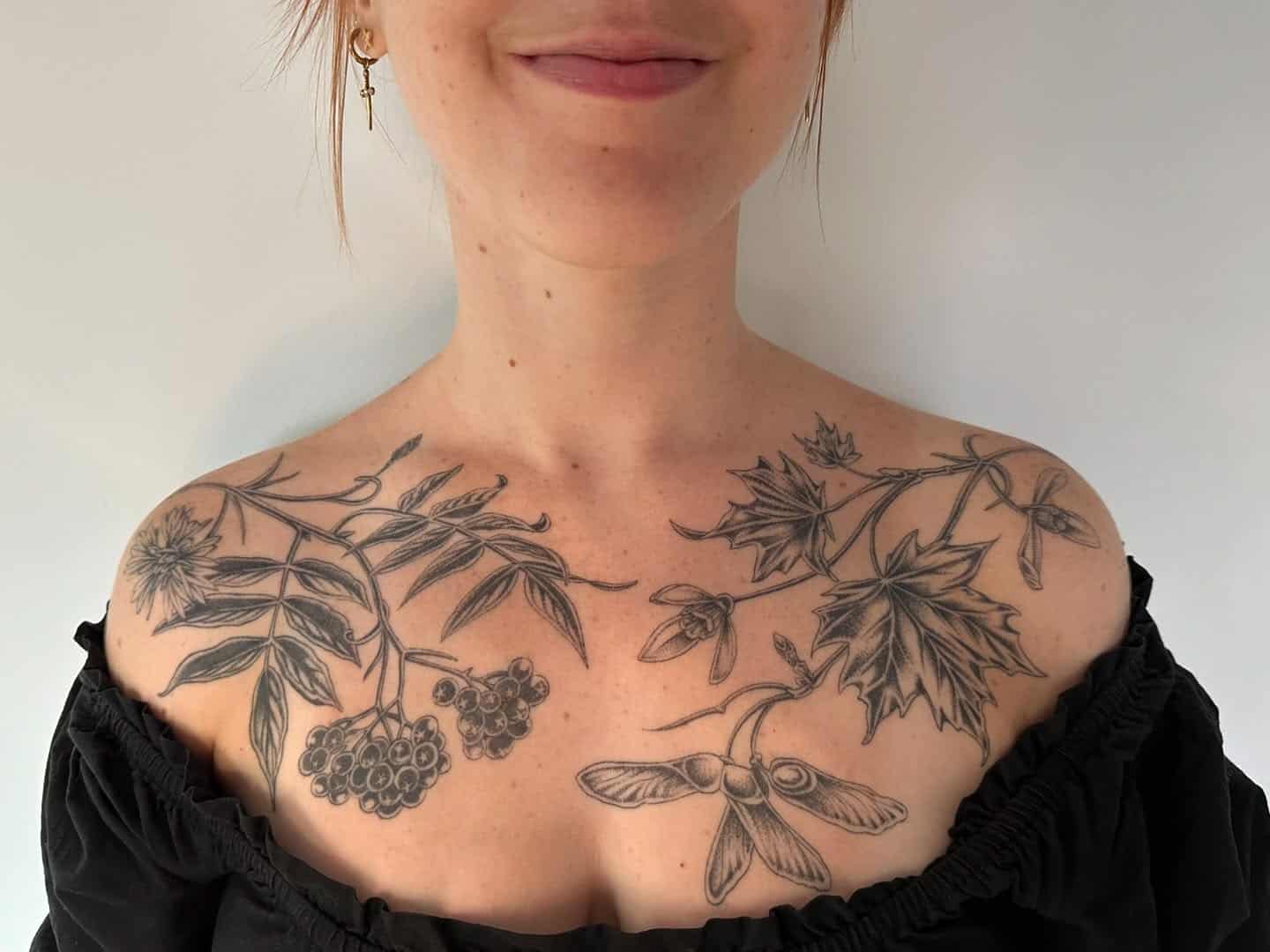 This image gives us a stunning floral chest tattoo that mixes nature and art so beautifully. I think the intricate designs of leaves and flowers create this sense of elegance and personal expression, which makes it a really remarkable choice for so many women.