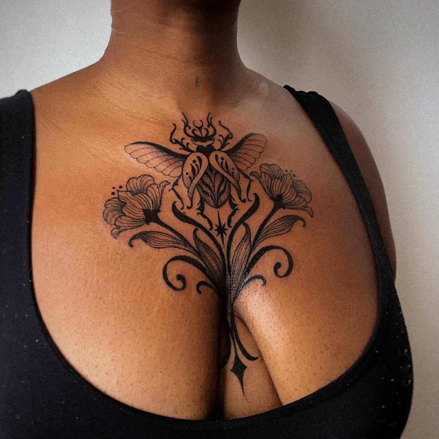 The delicate flowers and the bold shapes come together to tell a story of creativity and individuality. For anyone thinking about a chest tattoo, I think choosing a design that has personal meaning can make it even more special.