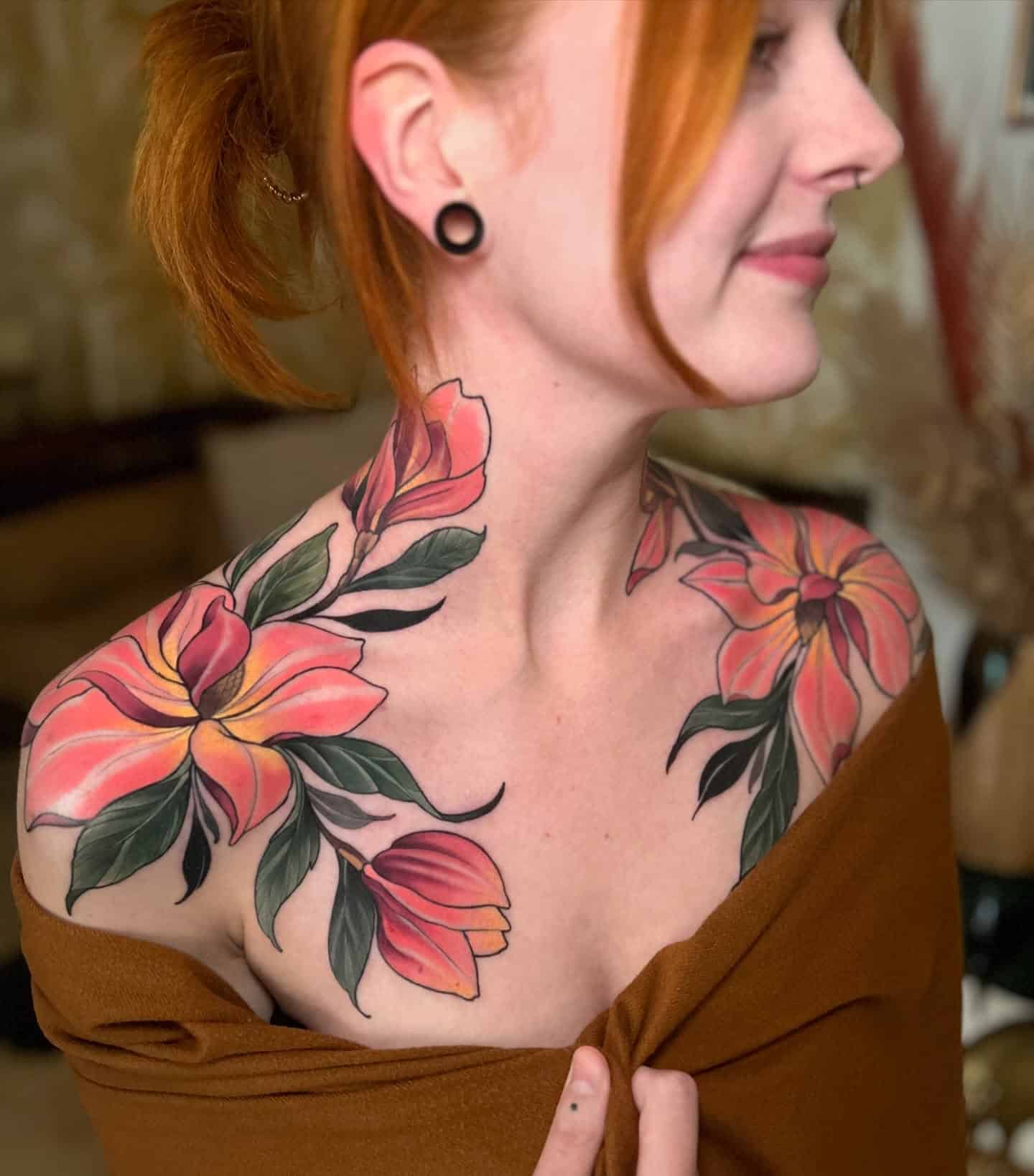 This look is all about vibrant color. This image highlights a stunning floral tattoo design that wraps around the shoulders and chest so beautifully.