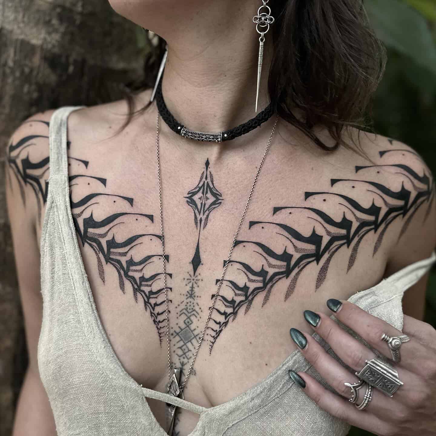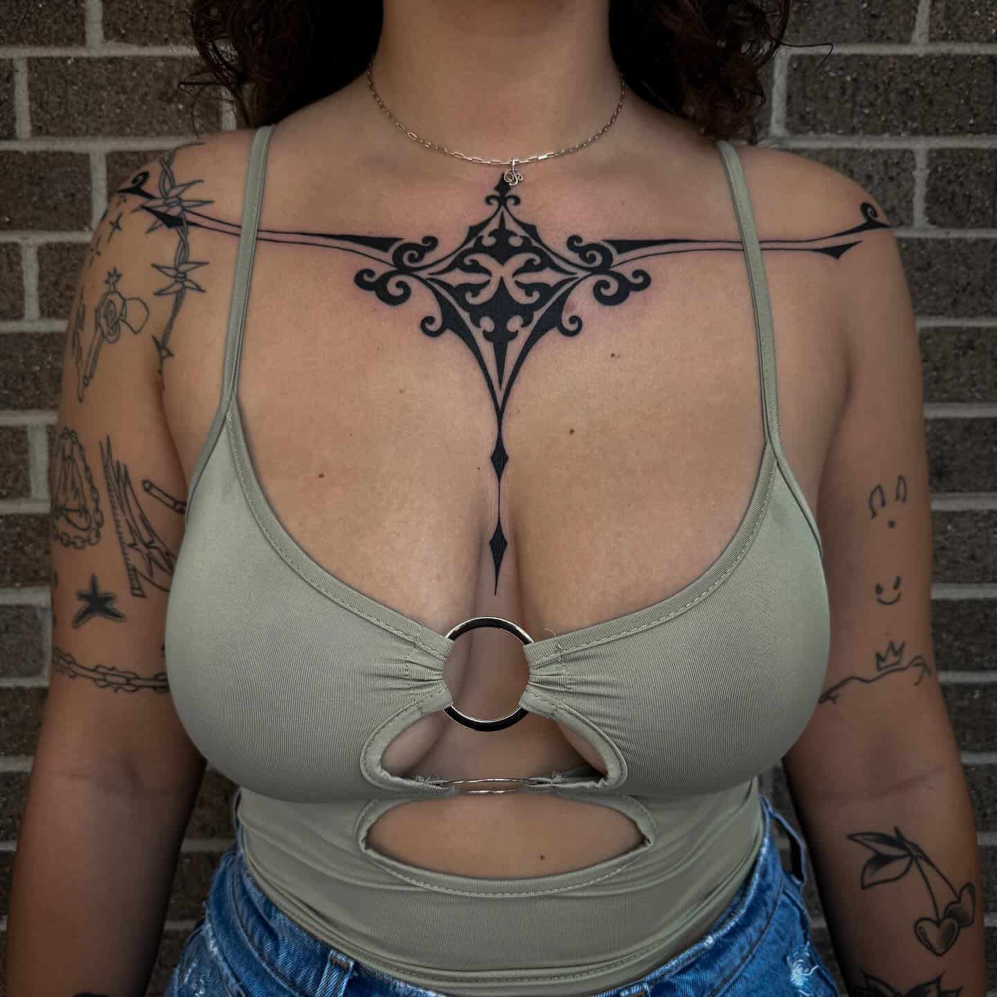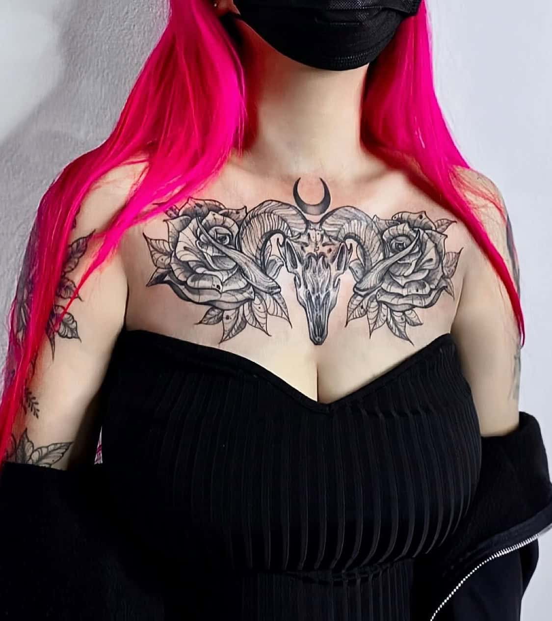 It’s not just the tattoo, it’s the whole vibe. This picture is a stunning display of tattoos that decorate the chest area so beautifully.