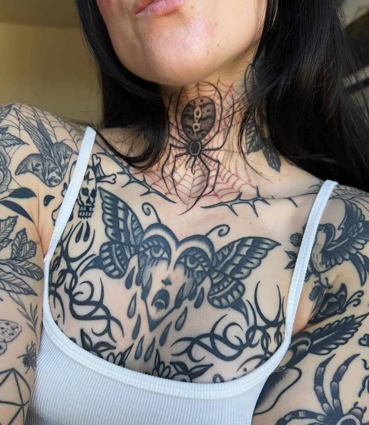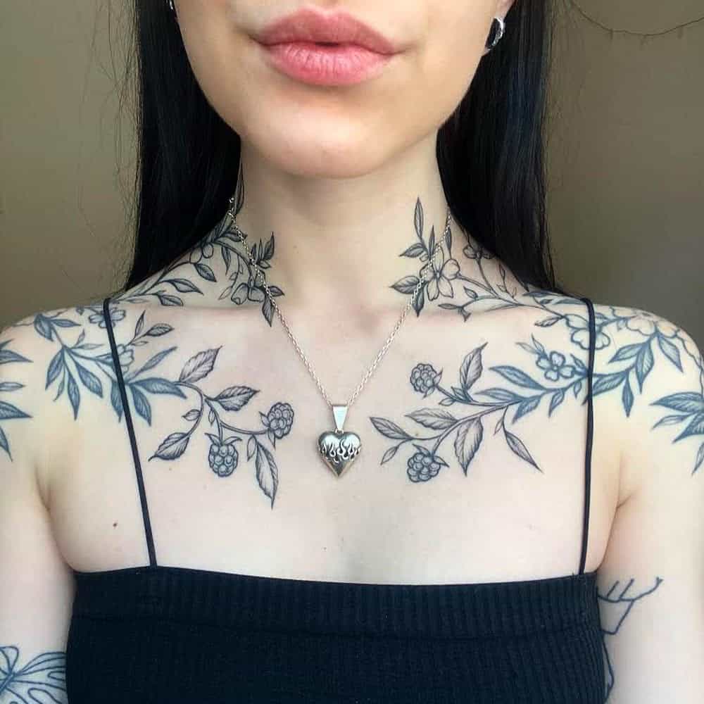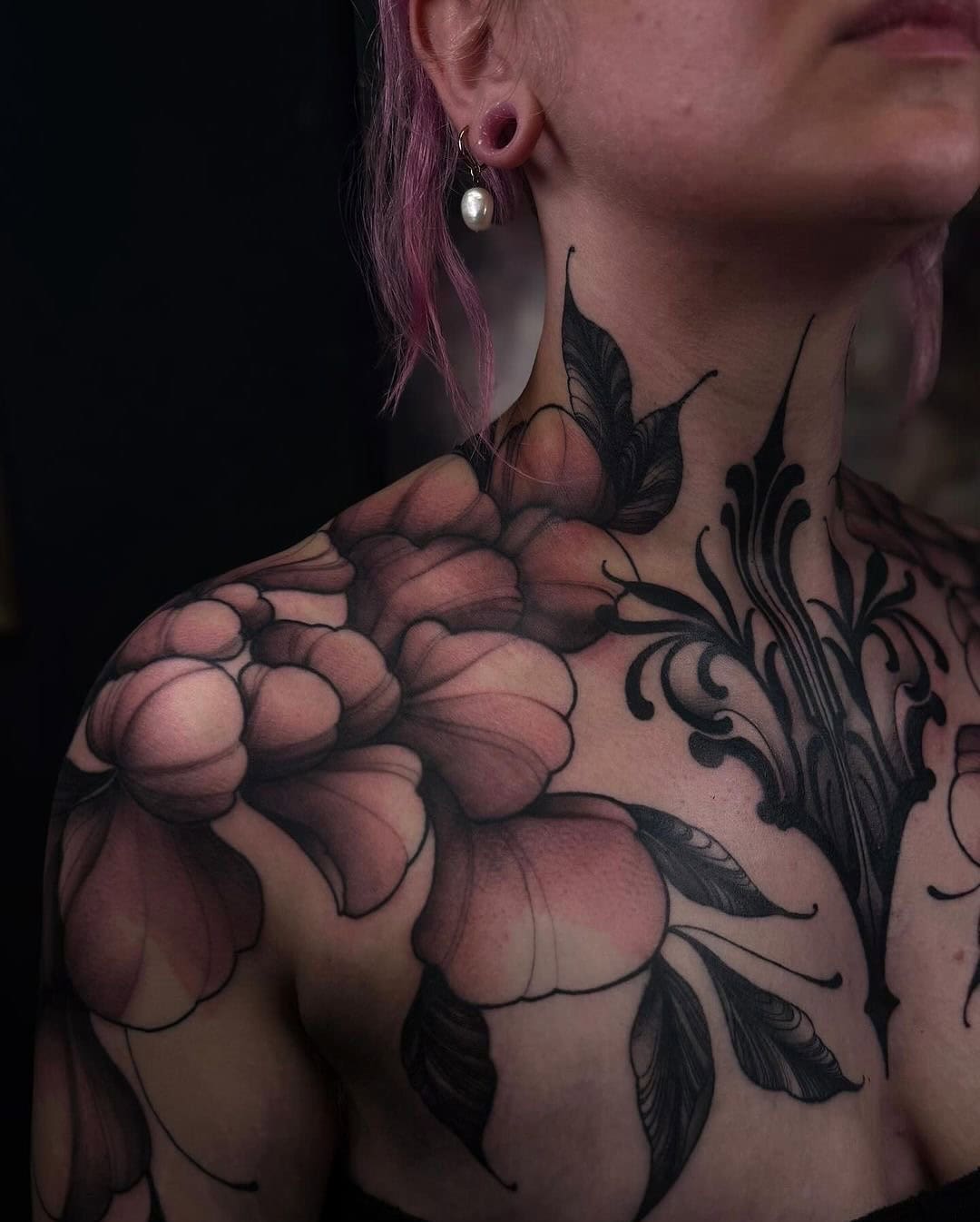 I am seriously crushing on this entire vibe. This picture gives us a gorgeous display of detailed floral tattoos that cover the chest and neck area so beautifully.