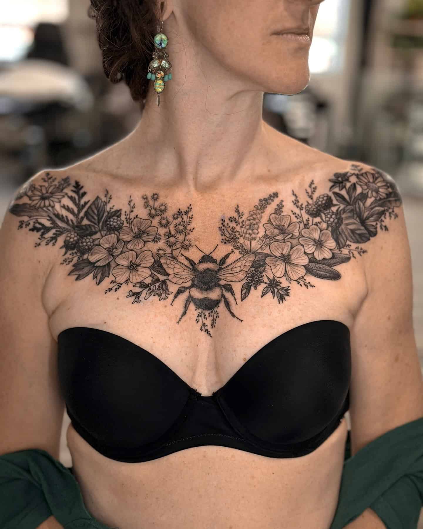 How adorable is this one? This stunning tattoo features an intricate design of flowers and a bee that decorates the chest just beautifully.
